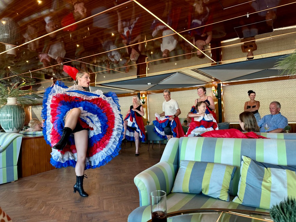 That evening after dinner, Cat was joined by a French-speaking singer and the two gave performed a cabaret show for us. The singer was talented, but I prefer English language songs (with a few notable exceptions) so it was not my favorite evening entertainment. Boris loved it. Cat had a few costume changes and ended with her cancan to the familiar music.