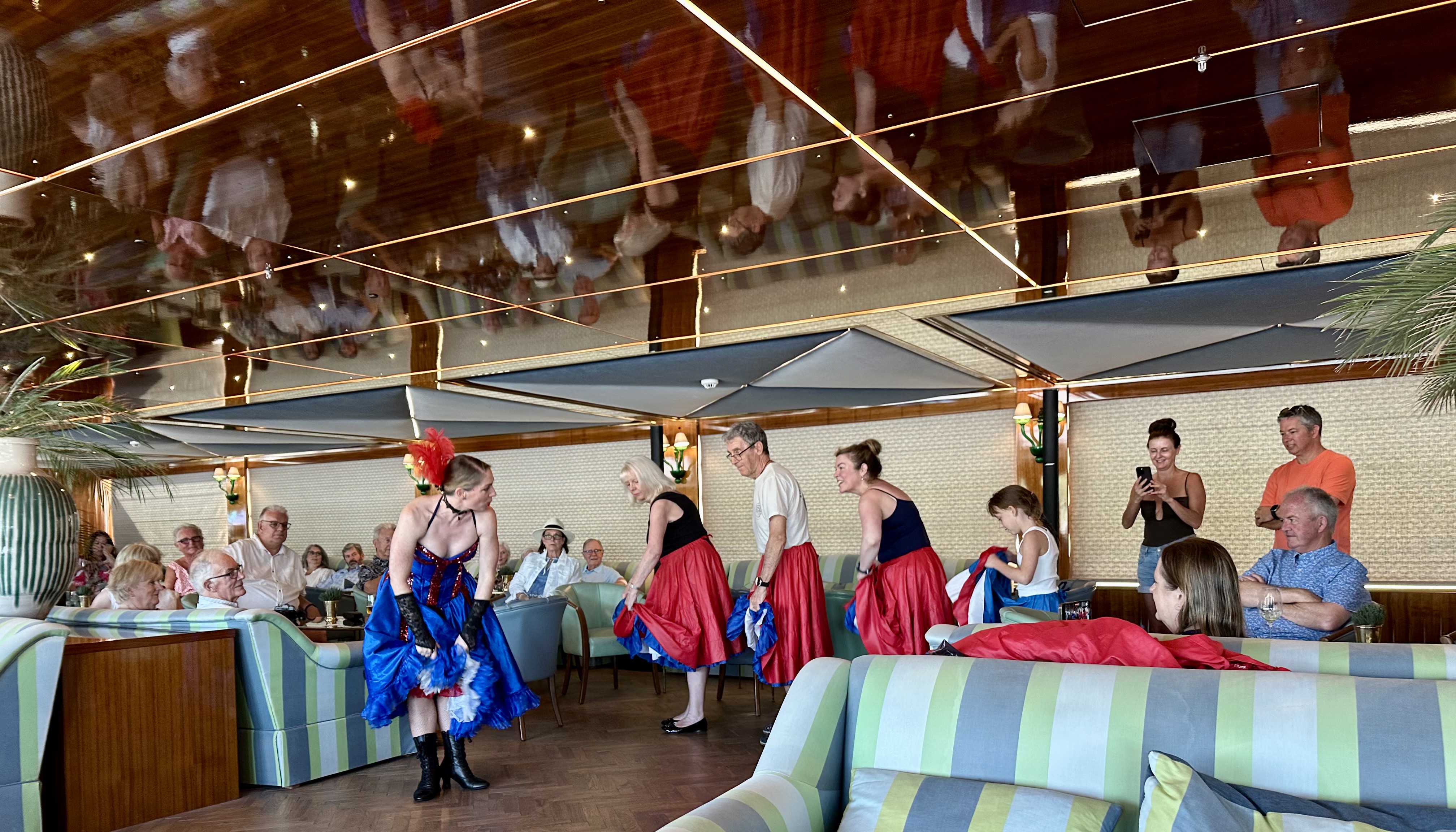 After a nap, we went to the lounge for the workshop. Cat (our instructor) started with a history of the cancan and then asked for volunteers to learn the steps. You even got to wear a special skirt. One of the children on board joined her, along with an older woman who used to dance and a father and his adult daughter from Scotland. He claimed his skirt was a kilt. Whatever works for him. Boris was pretty excited when the leg sweep demo happened over his head.