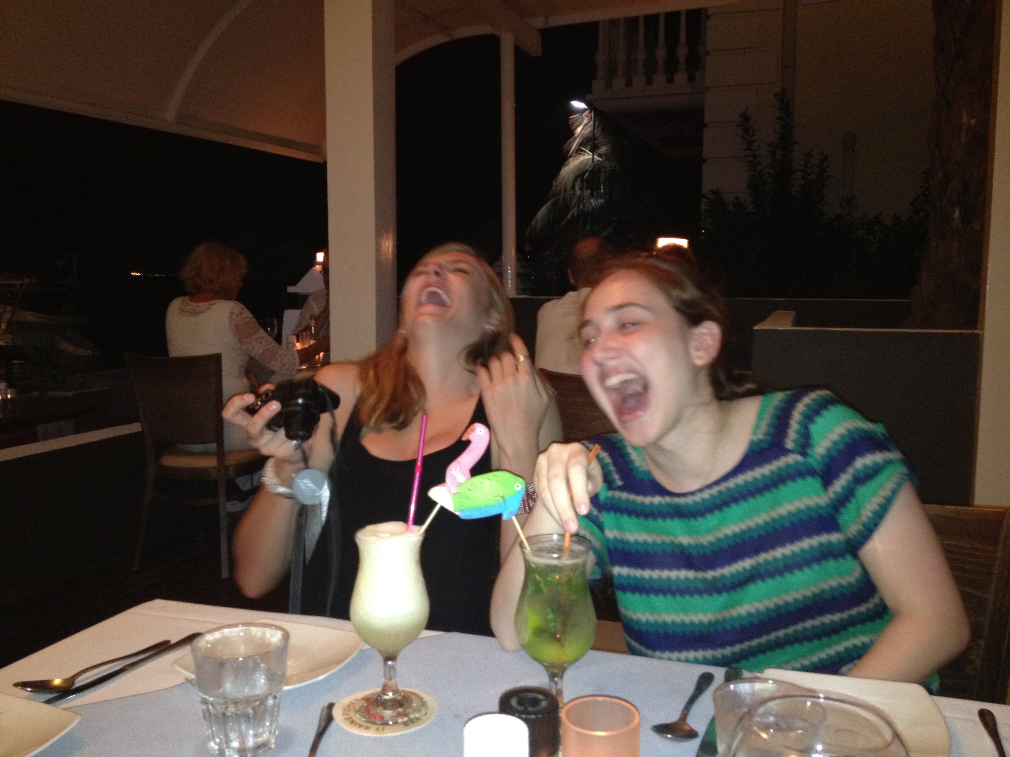 No night dive today, so cocktails at our friend’s house and then we all went out to dinner in town at a nice seafood restaurant, It Rains Fishes, where you sit on the porch and enjoy the breeze and the view of the harbor. The girls discovered that the drinking age in Bonaire is 16 and a nice time was had by all.