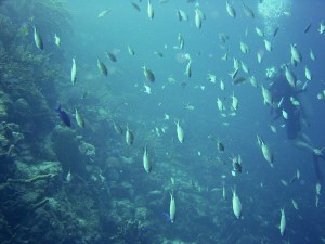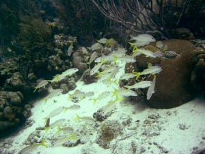 A school of yellowtail snapper. Svetlana would rub her tummy like she was hungry every time we would see them.