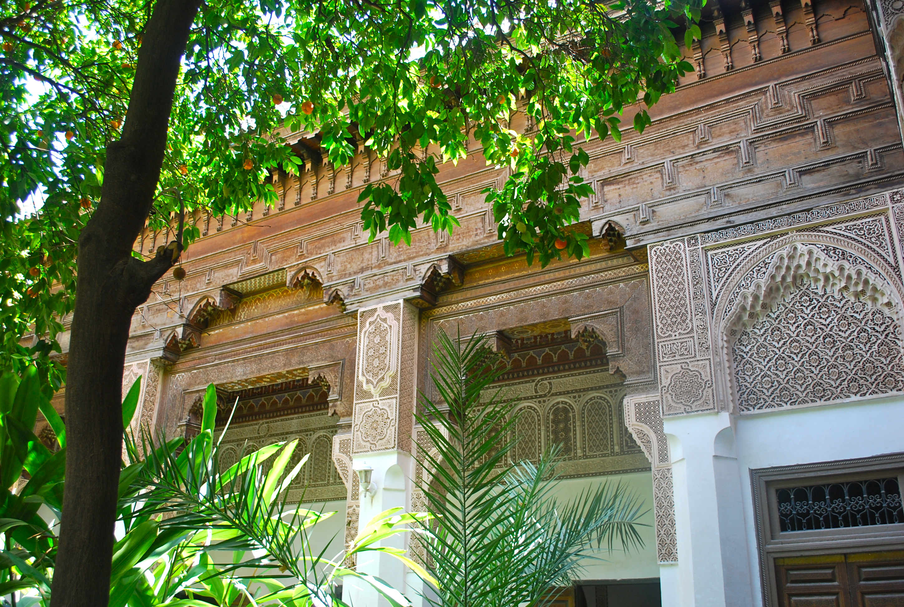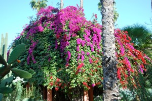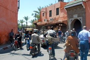 Marrakesh is an imperial Berber city established in 1062. It is often called “The Pink City” or “The Red City” due to the way the salmon-colored buildings look in the sun. Most of the Moroccan cities are whitewashed, but Marrakesh is pink to cut down on the blinding reflection of the sun on the white walls. The original settlers used to paint their skin an indigo color to protect themselves in the sun. Marrakesh is a city of almost one million people. We crossed a bridge coming into town, the mirror image of the 11th century bridge we will cross on our way out. There was delay as a tree was removed on the opposite side of the road so the road could be widened. Mahjid was upset that a 90-year-old tree would be removed for this “progress”.