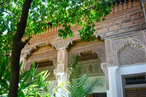 We went first to photograph the minaret and then crossed through the gates into the old city where we toured the Baja palace near the Jewish Ghetto. They are just starting to renovate the palace. Although it is not as beautiful as the Alhambra in Granada, Spain, it was in very good condition. After the tour, we went to lunch at one of the nicest restaurants in the city. We sat on low chairs around a table where food was served family style. 98% of the Moroccans eat we their hands, but we all opted for the offered flatware. Mahjid raved about the wine. I didn’t care for it and we learned later that he had never actually tried it.