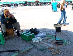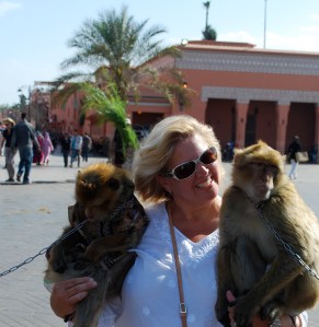 His girlfriend Mary is a bit of a daredevil who likes to heli-ski. When we went to the souk right after lunch, Mary was the first to have the snake charmer drape a live snake around her neck for a picture. The main plaza was filled with snake charmers who sat on carpets and made the cobras dance to the music from their pipes. Needless to day, the snakes they draped on your neck were not cobras. There were also those who had barbary apes who you could take a picture with. I opted for the apes. They ask for $20, but our guide had told us that a tip of $1 per person was appropriate.