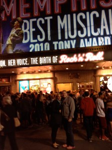 My niece Maggie was excited to see this production of Memphis for several reasons. When she graduated from High School we came to New York and her mom surprised her (and I surprised Rocky) with tickets to the Tony Awards. That year Memphis won best musical. The Tony Awards Show was a great experience that I can highly recommend. Its black tie attire, even for non-celebrities like us. Yes, we had to go in a separate entrance, but from the lobby balcony we watched Angela Lansbury, Scarlett Johansson, Catherine Zeta Jones, Lea Michele, Sean Hayes, Denzel Washington, Octavia Spencer and others enter. It was great to see what happens in the audience when the live show goes to commercial break. There were specific instructions on how to respond when we went live again. The energy in the room was infectious. (We had a “fabulous” dinner that evening too-hot dogs in the room before the show while we got dressed. It was the only time we brought them in and sat down to eat.)