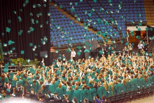Attending a graduation is a sports arena was a new one for me. It was the first time I have had the opportunity to order nachos while I watched this type of ceremony. (I didn’t actually order nachos, but the popcorn smelled so good I was really tempted to get some of that.) They made great use of the Jumbotron and if you watched the screen while the speakers presented, it was possible to catch a glimpse of your graduate. Graduations are always special, but I thought this one particularly nice.