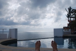 We arrived in the afternoon and enjoyed welcome cocktails on the pool terrace-two pina coladas for me. After a light lunch of fruit and ceviche, we swam in the infinity pool. It connects to a circular deepwater section that would be a wonderful training area for scuba divers. The deep area was off-limits for our game of Marco Polo. We did some “sun” bathing on a cloudy afternoon until the showers came. All of us fell asleep in the sun to be woken by the raindrops. Next was casual dress for dinner under the palapa.