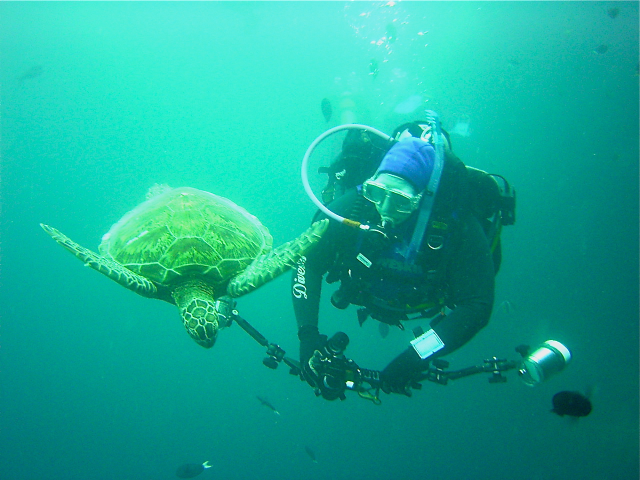 Dive Mom with one of our new friends. This was taken on my first big trip with Oceanic Ventures in July 2004 when I had only been certified a few months. We were off the coast of Borneo near Mabul Island, not far from the Philippines.