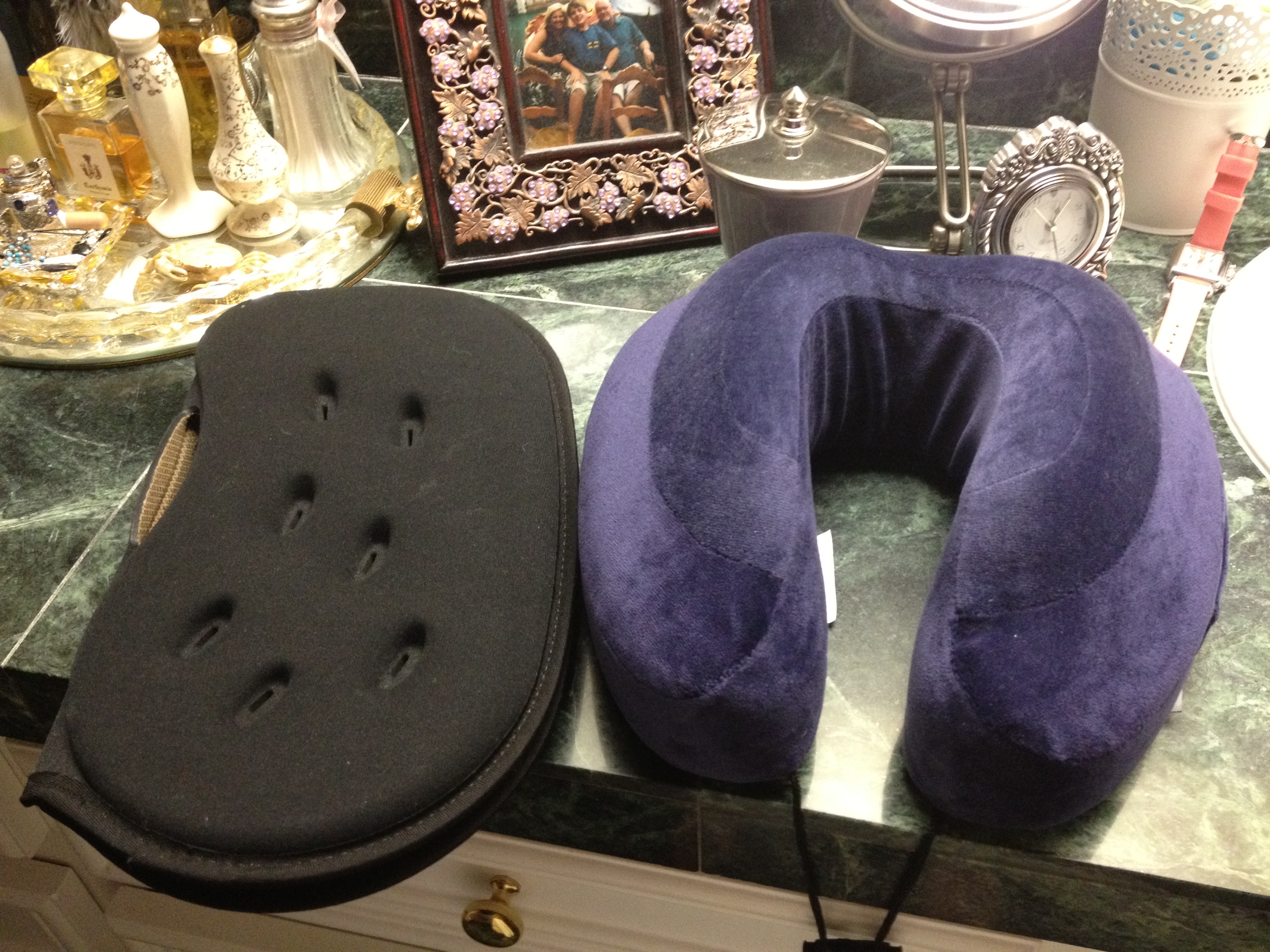 My g-seat, now shown closed with the carry handle to the left, is light-weight and don’t take up too much room in a tote or backpack. I also love my two layer neck pillow-note the raised center-which is sold with a travel bag you can tie to your carry on. I highly recommend these two items for long trips.