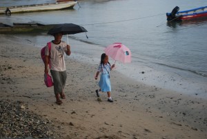 I am still not adjusted to the time change and having gone to bed at 8:30 pm, I woke up at 4 am. About six it was light (but too early for breakfast) so I walked down to the beach to see if the tide was in. There were children and their parents in school uniforms walking down the beach. After a while I realized that since it was so early they were probably going to catch the bus for school. At the point where our boat left us off yesterday there is a sort of parking lot. In the lot are jeepneys(a modified WWII jeep made from stainless steel) that pack them in. There are even passengers on top. We saw these all over Manila on our way out of the city.