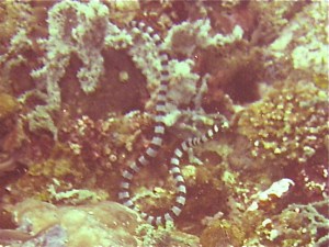 The banded sea krait (black and white sea snake) is from the cobra family and 5 times more poisonous. It will not bother you unless it agitate it. It is usually found on rocks.