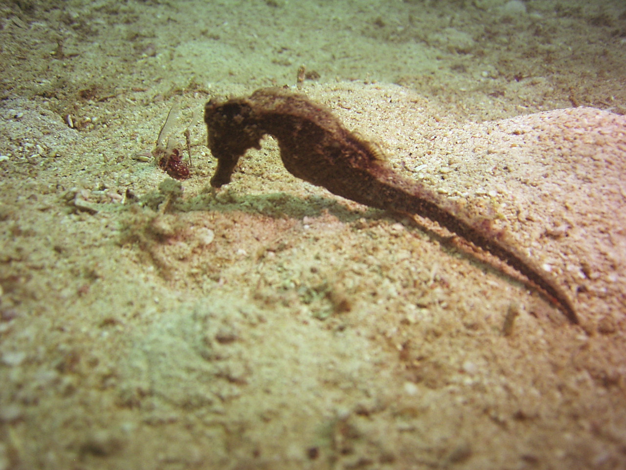 seahorse in the sand flats at the Giant Clam dive site. It lowers itself near the sand to protect against the current.