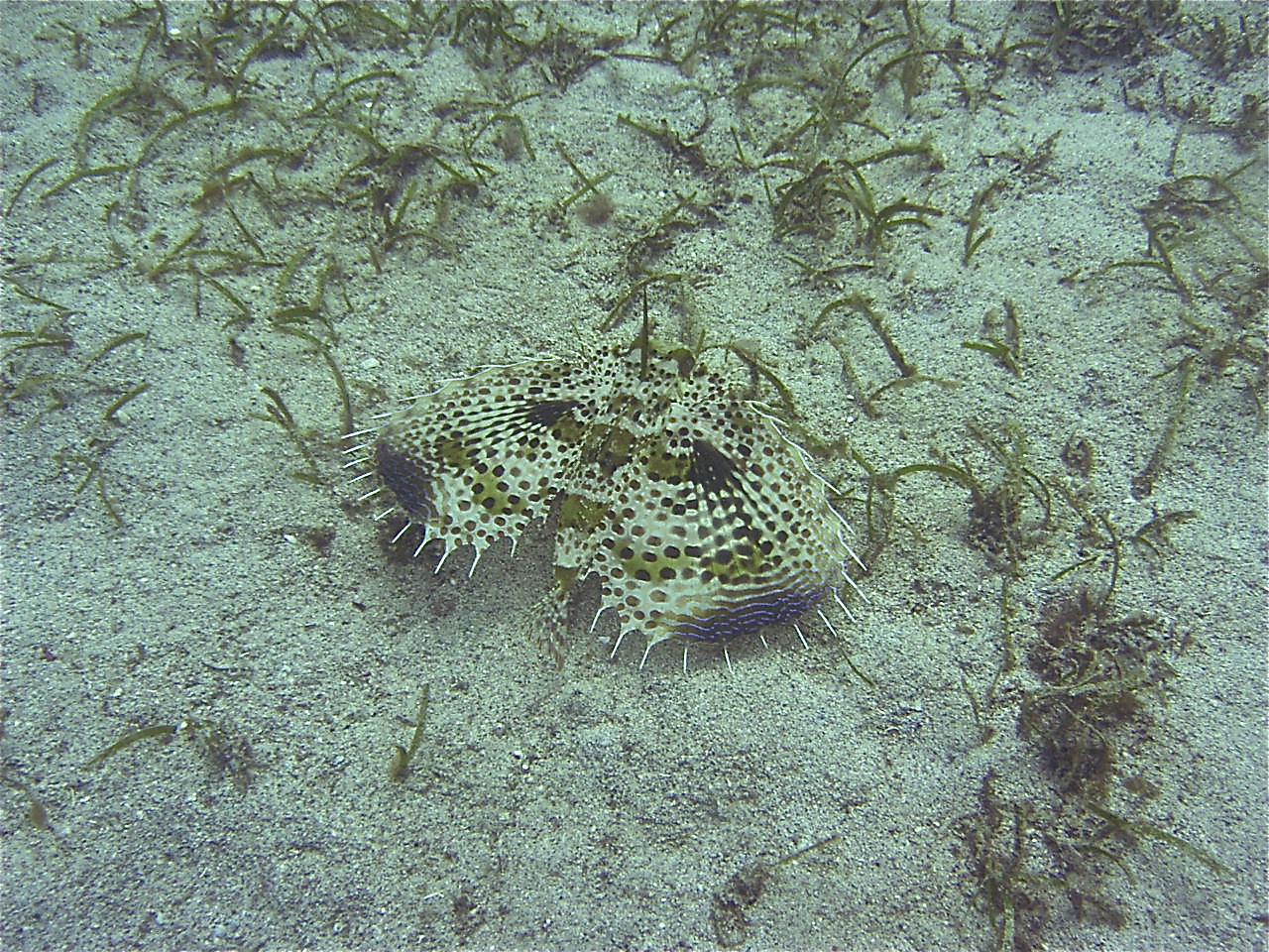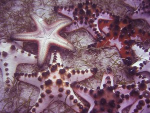 Our third dive of the day, after lunch was to the Sabang Wrecks. These are a series of three small wrecks where the boats are in pieces. None are as deep as the Alma Jane. More frogfish were found, both a warted white and a large green one. We also saw a mantis shrimp, commensal (small clear shrimp), and a flying gynard. We crossed a sandy area full of starfish. I like to think of it as a starfish garden. This is where we ran across Jess who had wandered away from his group. He joined us at the end of the dive. He has probably made 5,000 dives and just does his own thing.