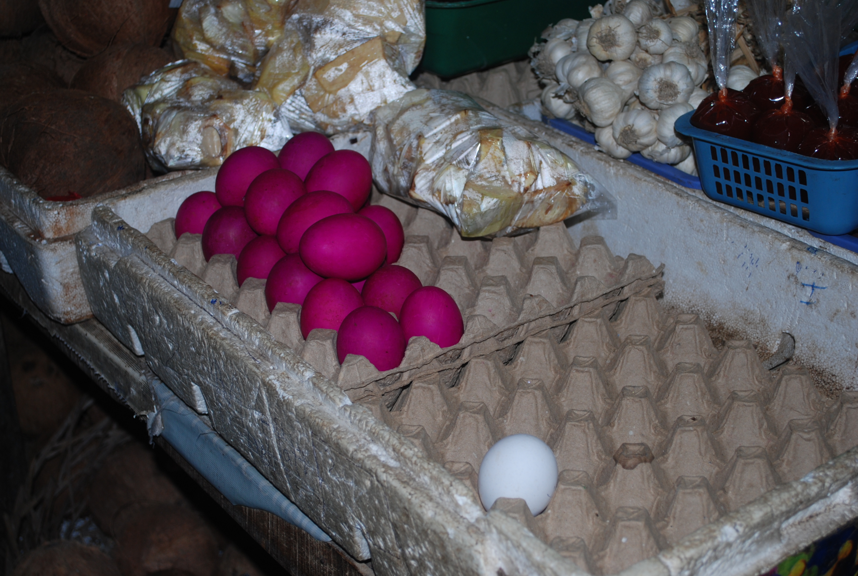 The purple eggs are soaked in brine giving them a salty flavor. Marco said they were great in salads. The are dyed to distinguish them from the regular eggs.