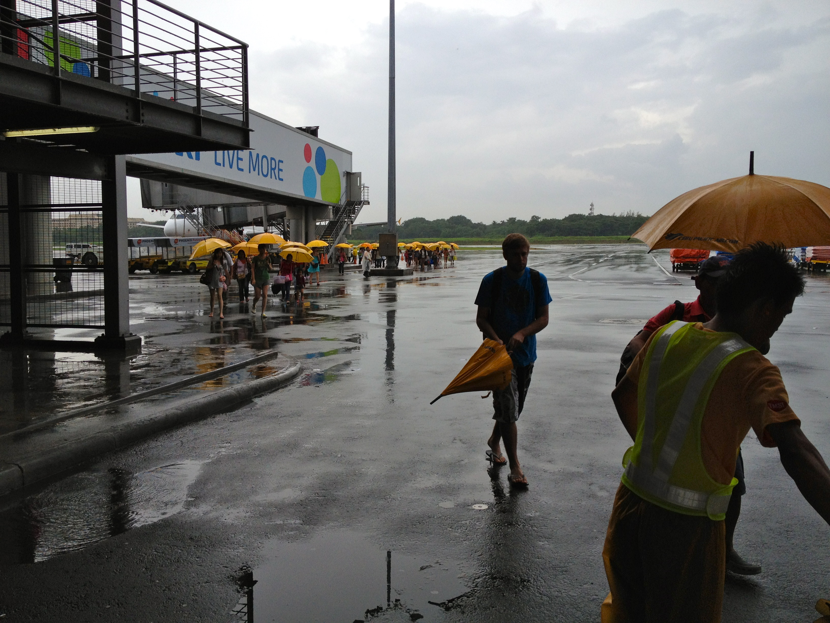 There was no jetway when we landed in Manila. It was raining so as you left the door of the aircraft you were handed an umbrella. Then you fumbled down the stairs with your rolling bag in one hand and an umbrella in the other. Luckily, my purse was a small backpack-styled one. Unfortunately, we had to collect our luggage at the domestic terminal and re-check it with Singapore Airlines in the international terminal. The terminals were quite far apart and we had to be transported by van from one to the other. (Atlantis handled the transfer.)