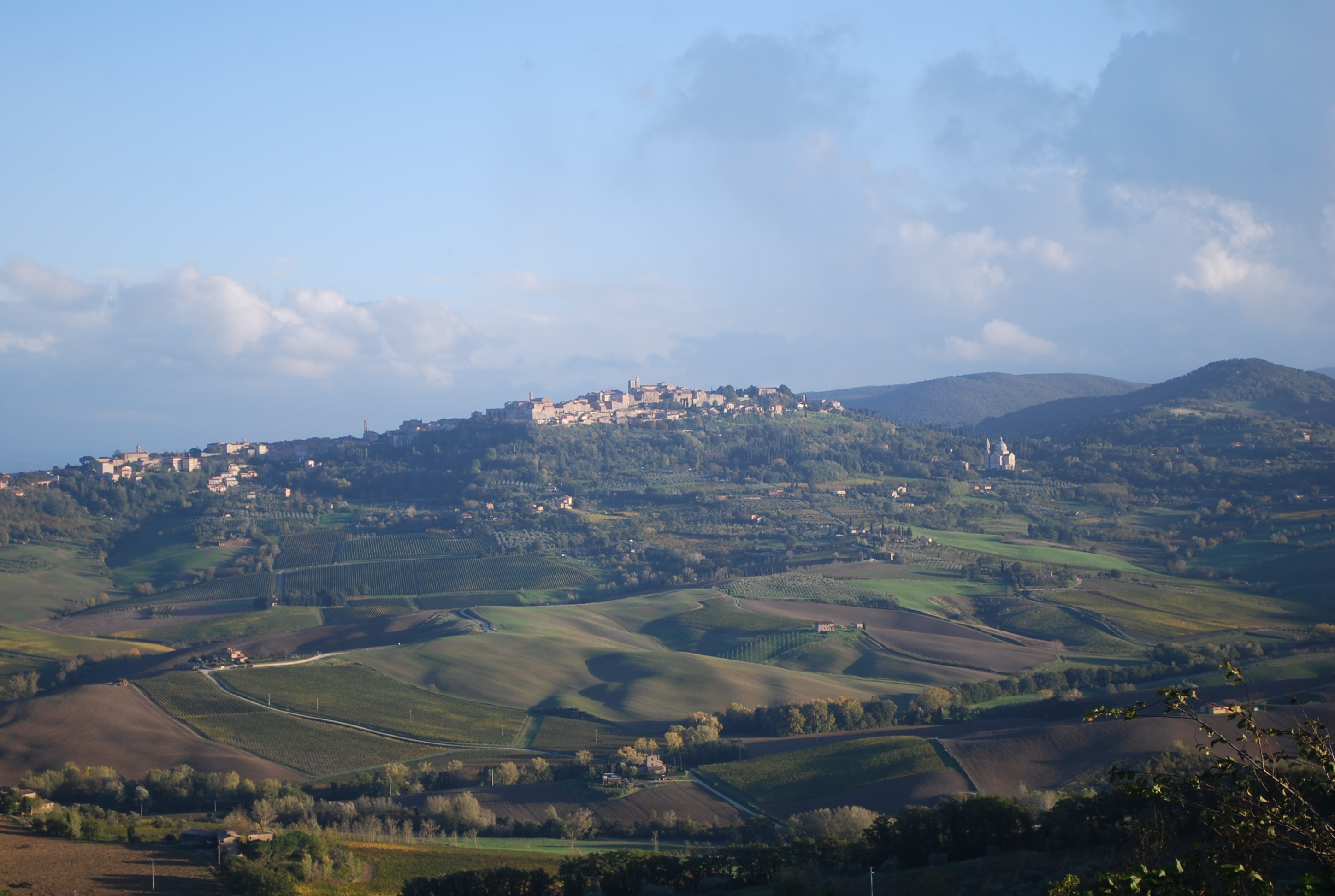 We hated to give up our great parking spot (and what an excellent job of parallel parking Natasha if I say so myself), but it was on to another of Insight Guides‘ top 10 hilltowns, Montepulciano. We can actually see Montepulciano from the end of our street in Montefollonico. When I was at the vantage point near Chiesa del Triano, I spotted and photographed this marvelous city without knowing what it was. It is only 5 km away but reached by winding roads that are longer.