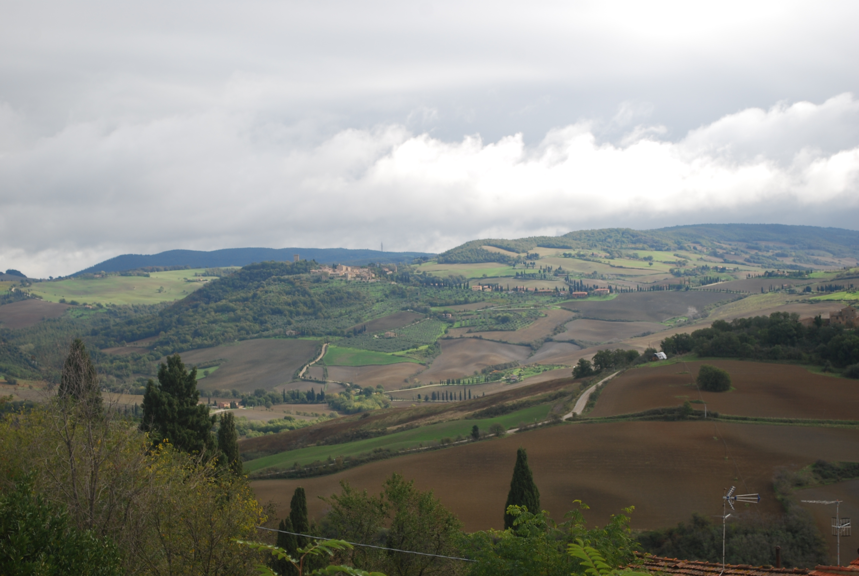 At our late lunch (by American standards), Boris discussed our next city, but after he made the climb down he was tired and we packed it in for the day. On the way back, we found the old road to Montefollonico and I drove through the vineyards and the valley that I see from the end of our street near Chiesa del Triano. It might have been the prettiest road of the day. (It was certainly the roughest.)