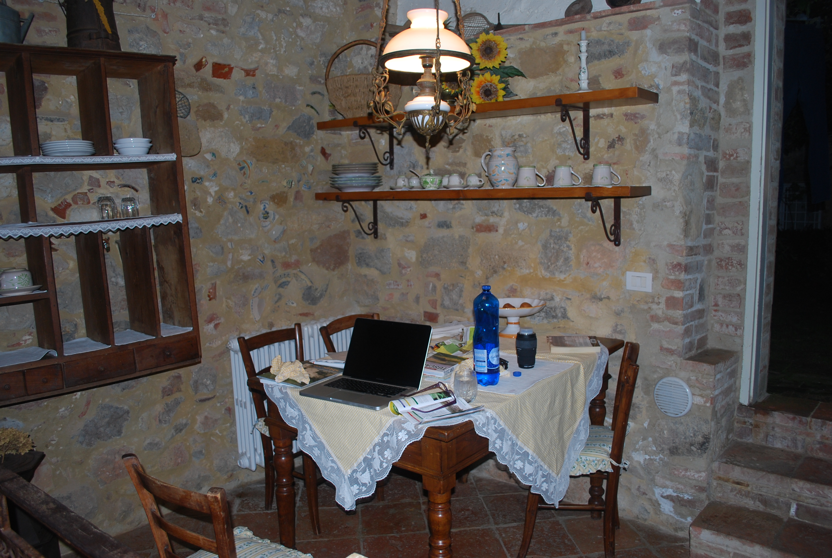 While Boris took over the front sitting room in the house with the television on the Italian stations, the kitchen table area was my hangout spot while at Casa Galente or Galantino in Montefollonico. This is where the magic of the blog happended. From my spot, I could look out over the large garden and see the sunsets.