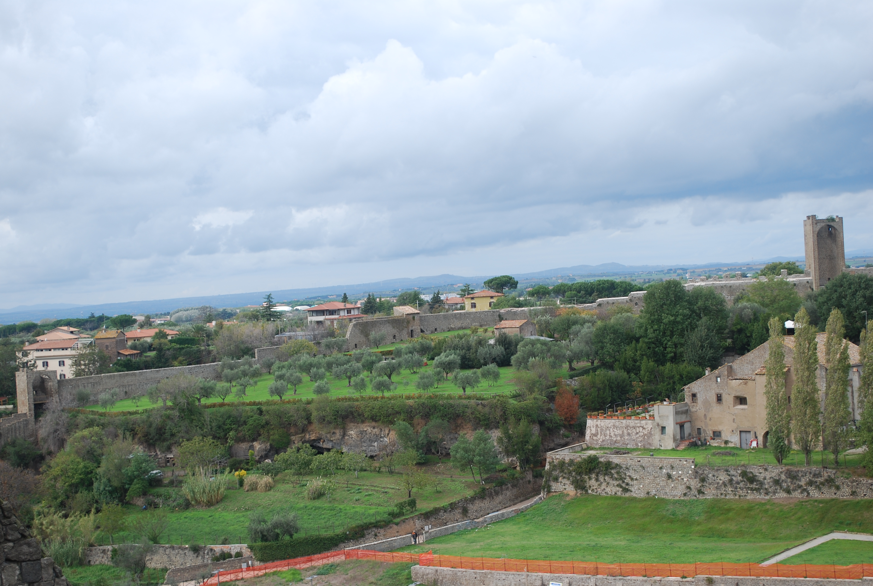 With the fog, our drive to the Autostrada was not as picturesque as it has been in previous days. We drove through Tuscany, Umbria, and just after crossing into Lazio exited at Orte in the direction of Virterbo. Orte is one of those cliff-hanging cities that looks like it is about to fall down the hillside at any minute. There is also an wonderful aqueduct on the right side of the city as you head south on the A1. Orte, originally the Etruscan city of Hurta, is an important stop on the Florence-Rome railway.