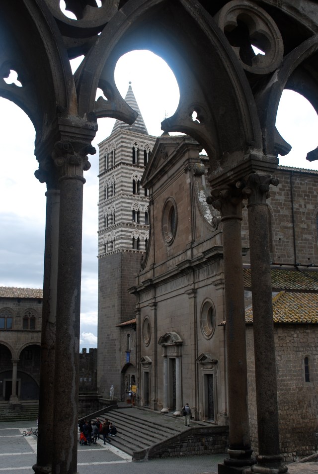 I have often heard that shopping was the #1 activity while people are on vacation, and the visitors to Viterbo, 50 km from Rome, were out to prove that. The stores were far busier than the historical sites. After wandering around the Piazza delle Erbe and Piazza Mario Fani while Boris read his guidebook, we returned to the Piazza del Plebiscito which has been the administrative center of the city since the 13th century, and headed south past the Piazza del Gesu and its churches and Piazza della Morte to the Cathedral.