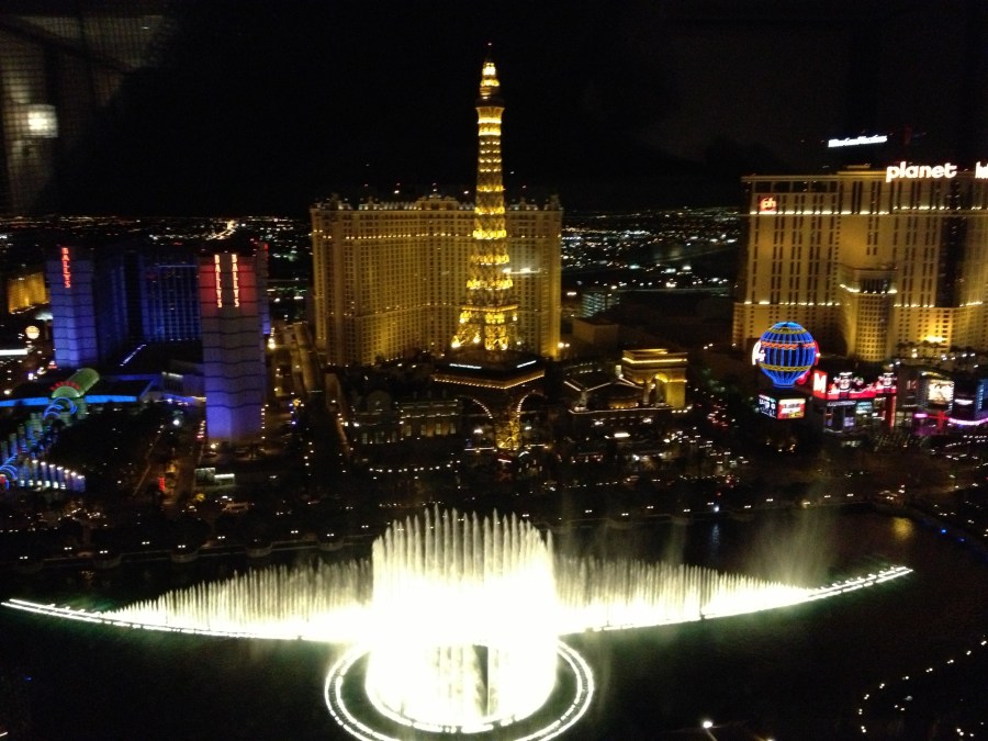 The Bellagio Fountains as seen from our Penthouse Suite. What a view!! ©Jean Janssen