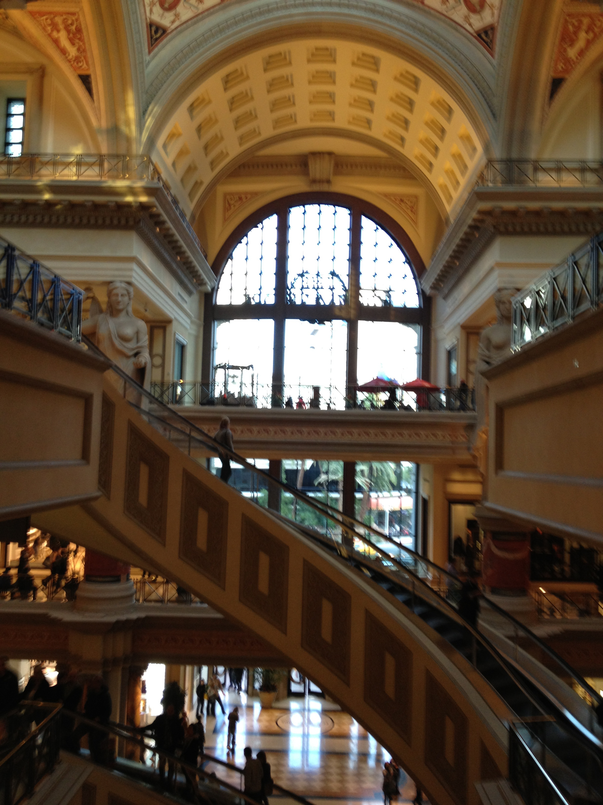The curving escalator and three story statutes at the Forum Shops at Caesar’s Palace Las Vegas. ©Jean Janssen