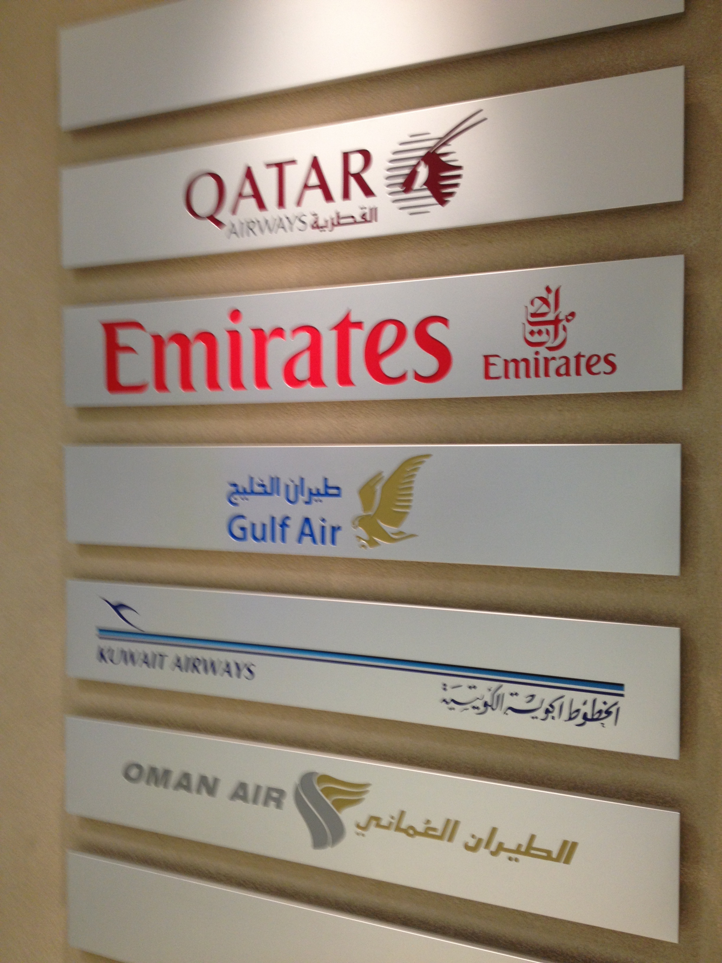 The plane was clean and relatively new; the service was good. The movie selection is one of the best I have seen. We were in economy, but the passage through Business Class showed it to be very nice. Most surprising was that all of the signage was in English and Arabic. As they put up the route map, I noted that I have never seen the names of cities in Arkansas written in that lettering.