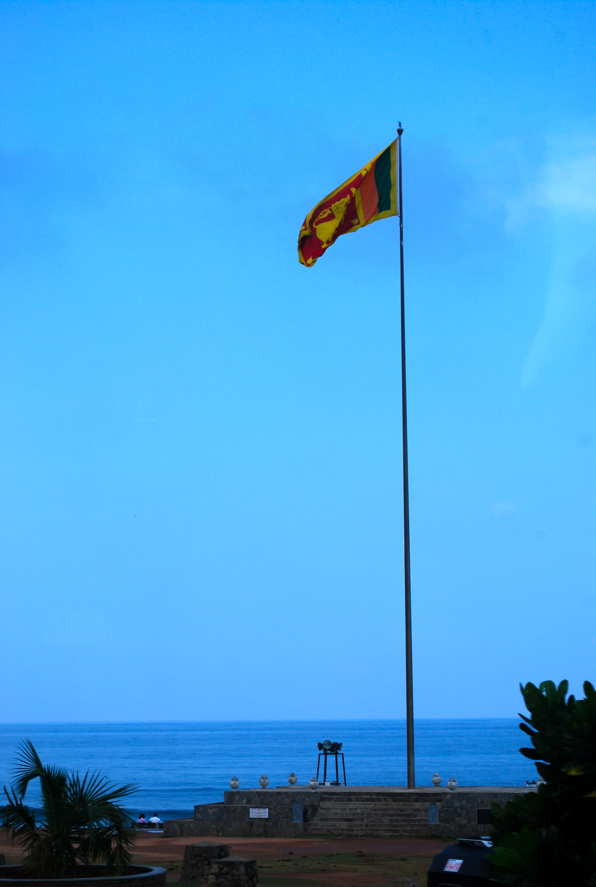 Sri Lankan flag with colors representing various ethnic groups.  The backdrop is the Indian ocean. ©Jean Janssen