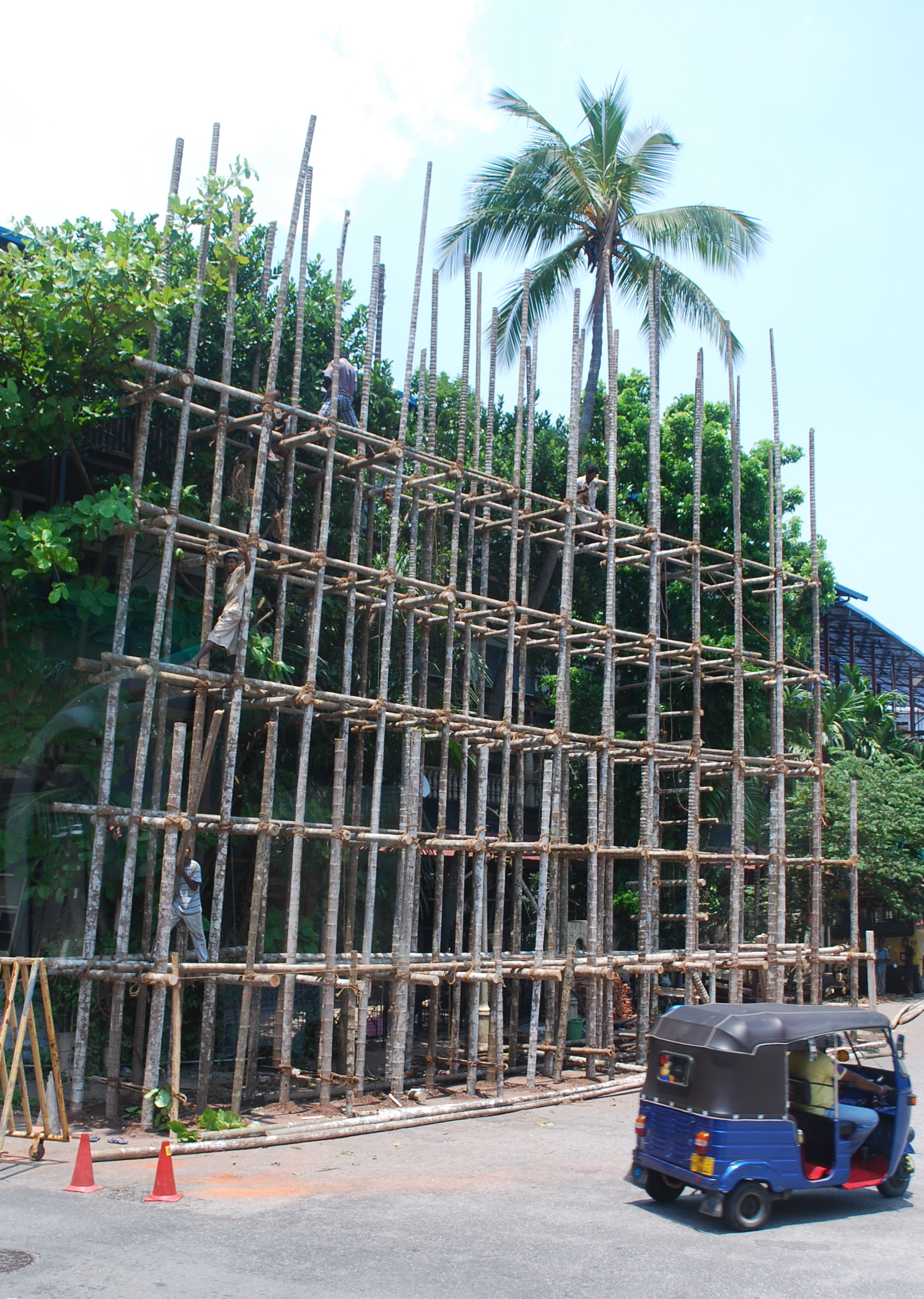 The Gangarmaya Temple is the site of the Navam Perahera on the February poya (full moon) day each year.  It is a large celebration of colorful costumes and a parade of elephants.  The full moon occurs twelve times a year and we will be in port tomorrow during poya.  We’ll see how this monthly holiday affects our touring.  There were a couple of other photo opts along the streets by the temple.  An old tramcar sat right across the street and restoration work along one side of the temple had required tall scaffolding constructed primarily from bamboo.