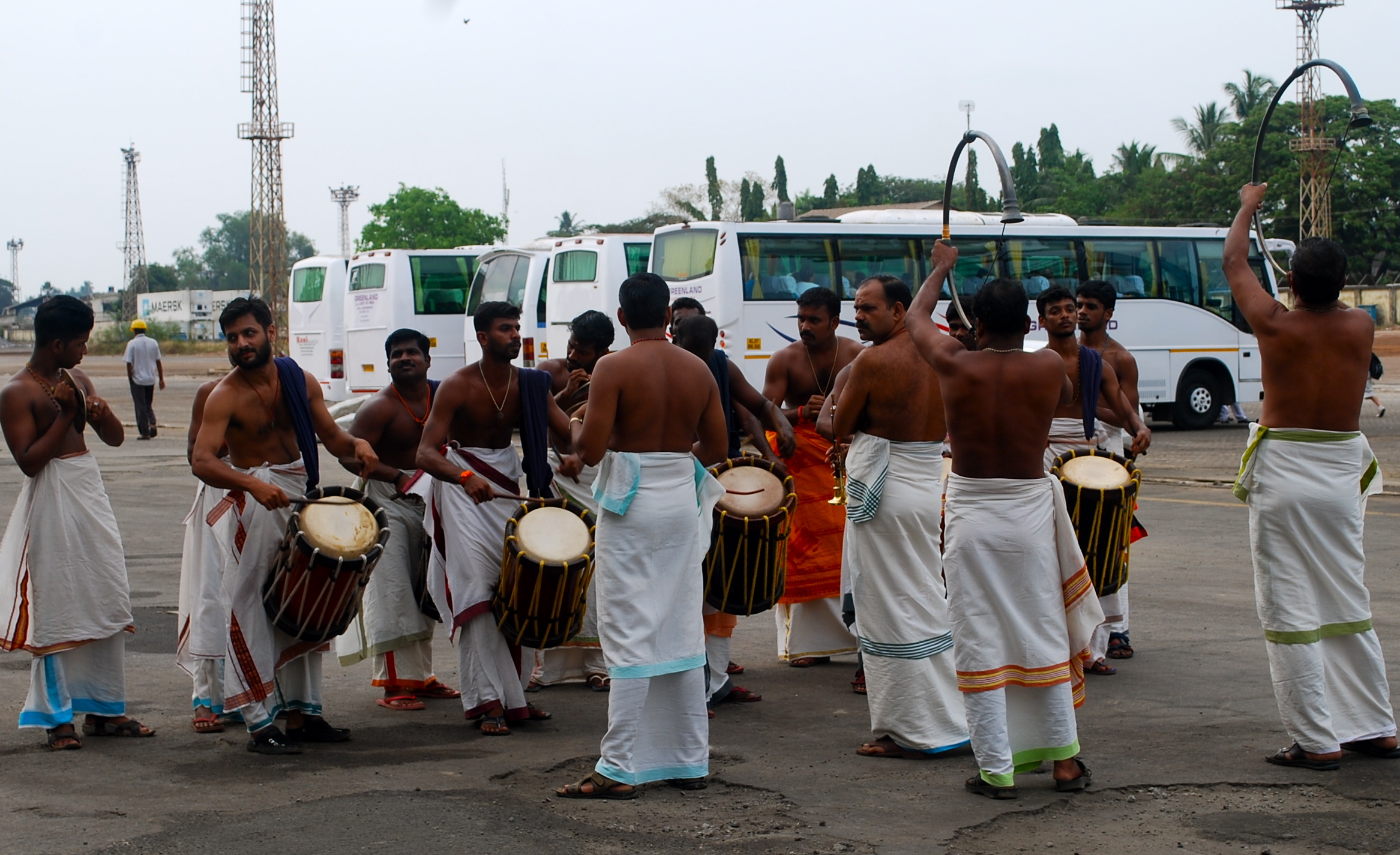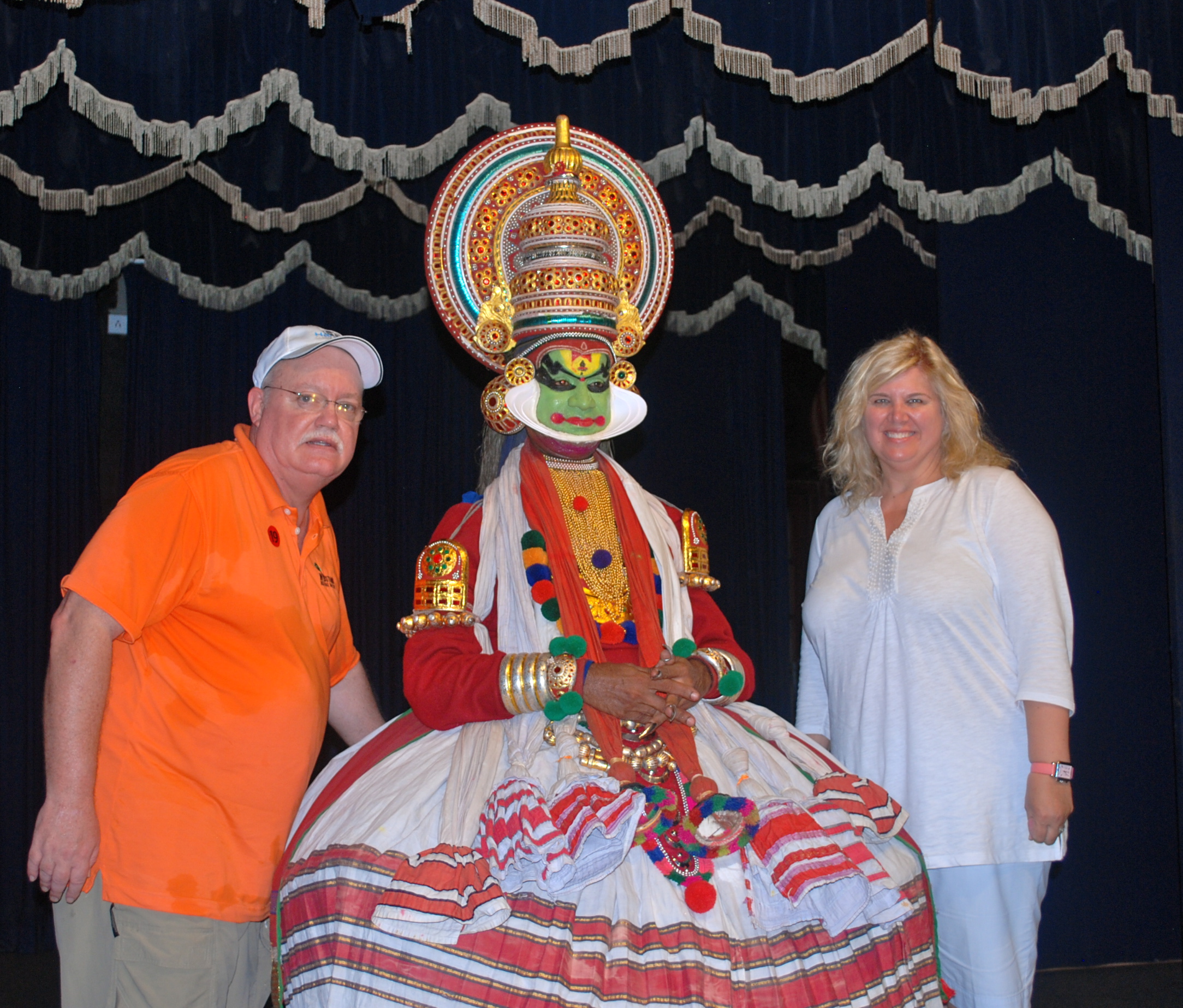 Our last tour stop was at Greenix Village dedicated to preserving Kerala’s art and culture. Our tour groups saw a private performance of Kathakali theater, a Buddhist ritual. A full performance may begin at 6 pm and continue until 2 or 3 the following morning. We were given a demonstration on the various facial and eye expressions and also the language (done as sign language). The heavily made-up performers presented a segment of a full play. We saw two actors (in a full play there are 7-10 characters), two musicians, and a chanter. The muscle coordination of the face was extraordinary and the eye movements equally challenging. Students begin the study at age 8-10. It normally takes 15 years to learn the complex performance techniques. It is a traditional art form from the 18th century. Kathakali Theater reminded Boris and I of the Chinese Opera Performance we saw with Rocky in Beijing.