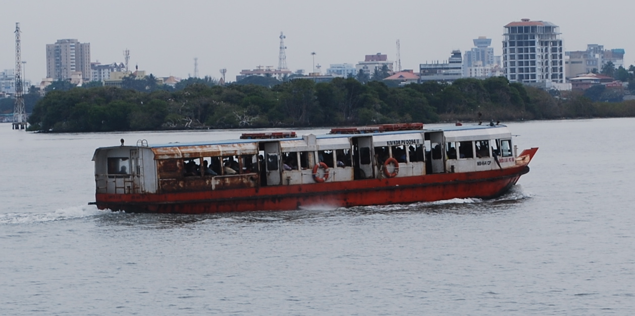In the morning after we docked I had seen several boats I assumed were ferries headed in the direction we came. These were actually our touring boats. They were all a little different with “handmade” touches; all were rustic and worn. I felt bugs biting my legs. However, our tourist boat was certainly a step up from the public ferries I saw leaving from the dock over. Kochi, or Cochin to use the colonial name, has a natural harbor. There are 18 islands in this area. You look out to the Arabian Sea and the Western Ghats. As we rode around the harbor, we saw dolphins. Cochin has the distinction of having had the first container cranes in India. (We see them in all the major ports now. In Colombo, Sri Lanka they were right next to our balcony.)