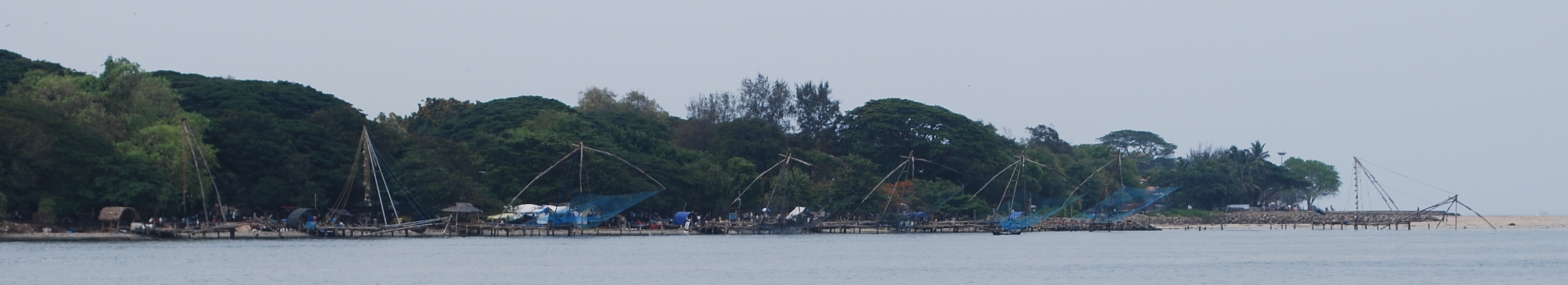 We passed several spots where the fishing boats were anchored, icehouses, conveyor belt loading stations, and a market area. Each of the fishing boats has a name that indicates the religion of the owner. All are colorfully decorated. The highlight was the view of the Chinese fishing nests. It is outdated technology, but requires no mechanization or fuel (only manpower). They only work at high tide. It takes 5-6 men to raise and lower the nets. The large net is placed in the water for 3-5 minutes, raised, and the fish removed. They catch mullet, shrimp, and crab in the nets.