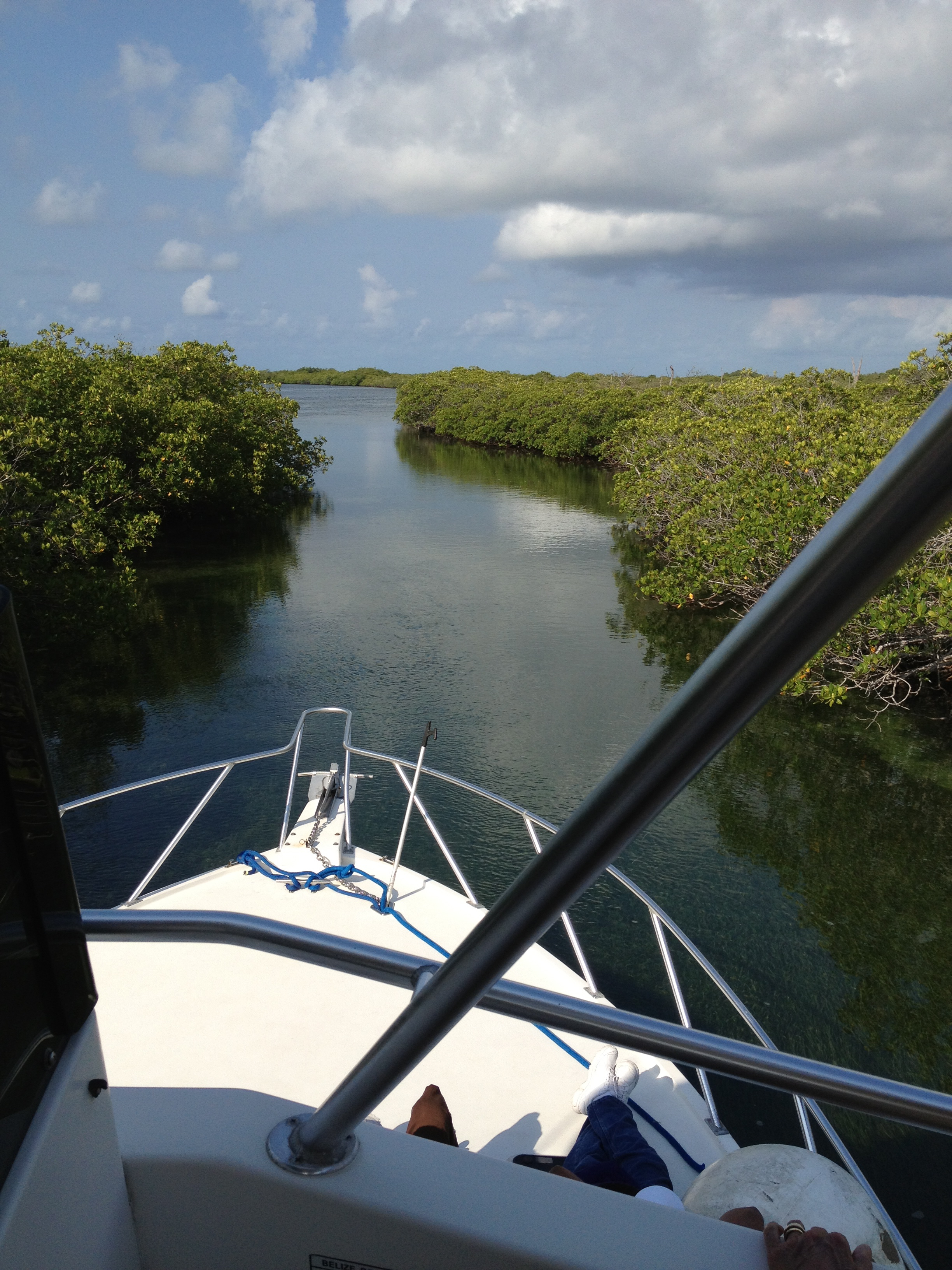 When we got word that there would be a two-hour delay for some of the guests, they went ahead and took us early to make sure the big boat would pass through the mangroves before dark.  “An atoll is a ring-shaped coral reef including a coral rim that encircles a lagoon partially or completely.  There may be coral islands (cays) on the coral rim.”  We are headed to the Turneffe Atoll, the largest atoll off the coast of Belize.   In November 2012, Turneffe Atoll was named a marine reserve.  It is 30 miles long and 10 miles wide with 12 acres of island.