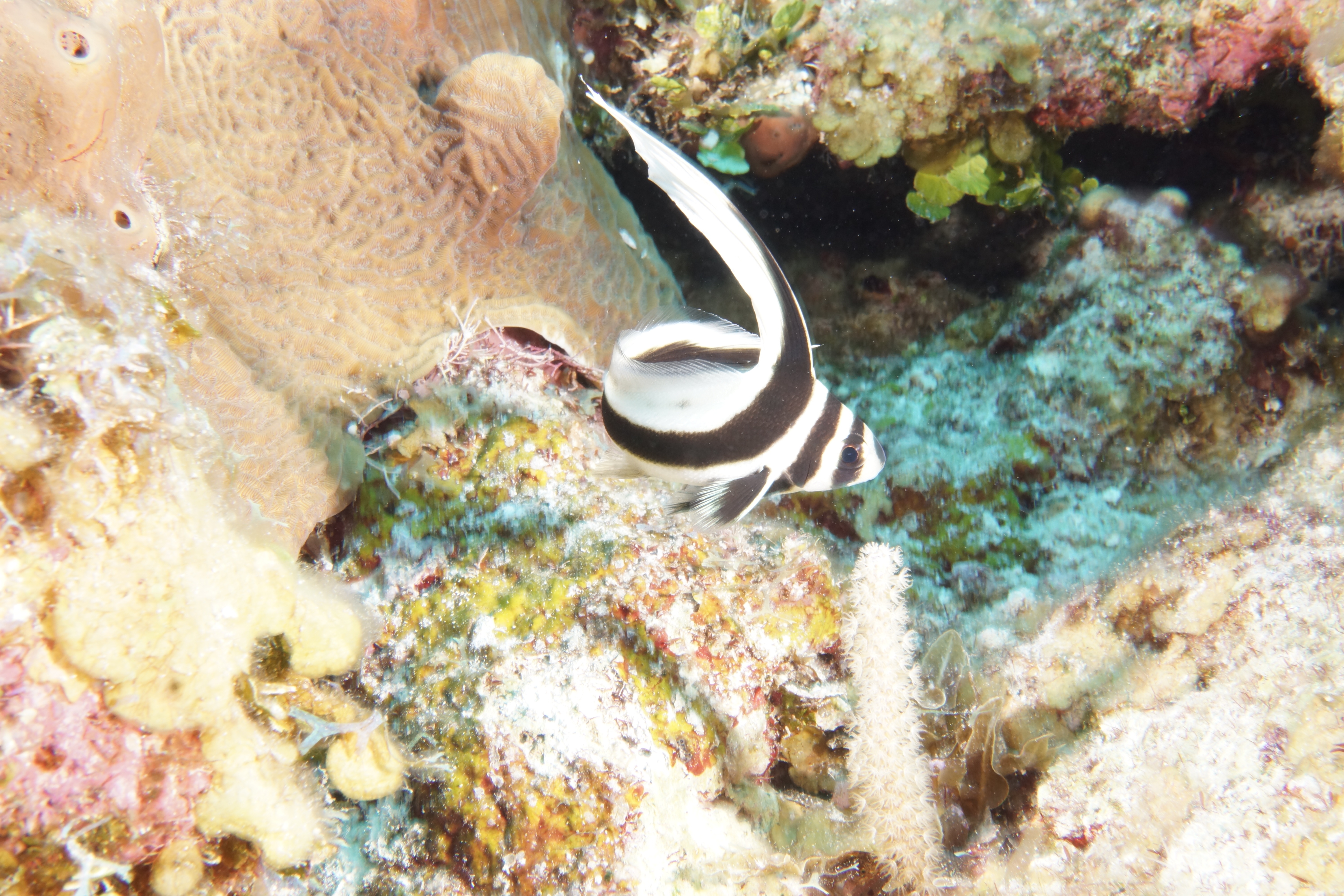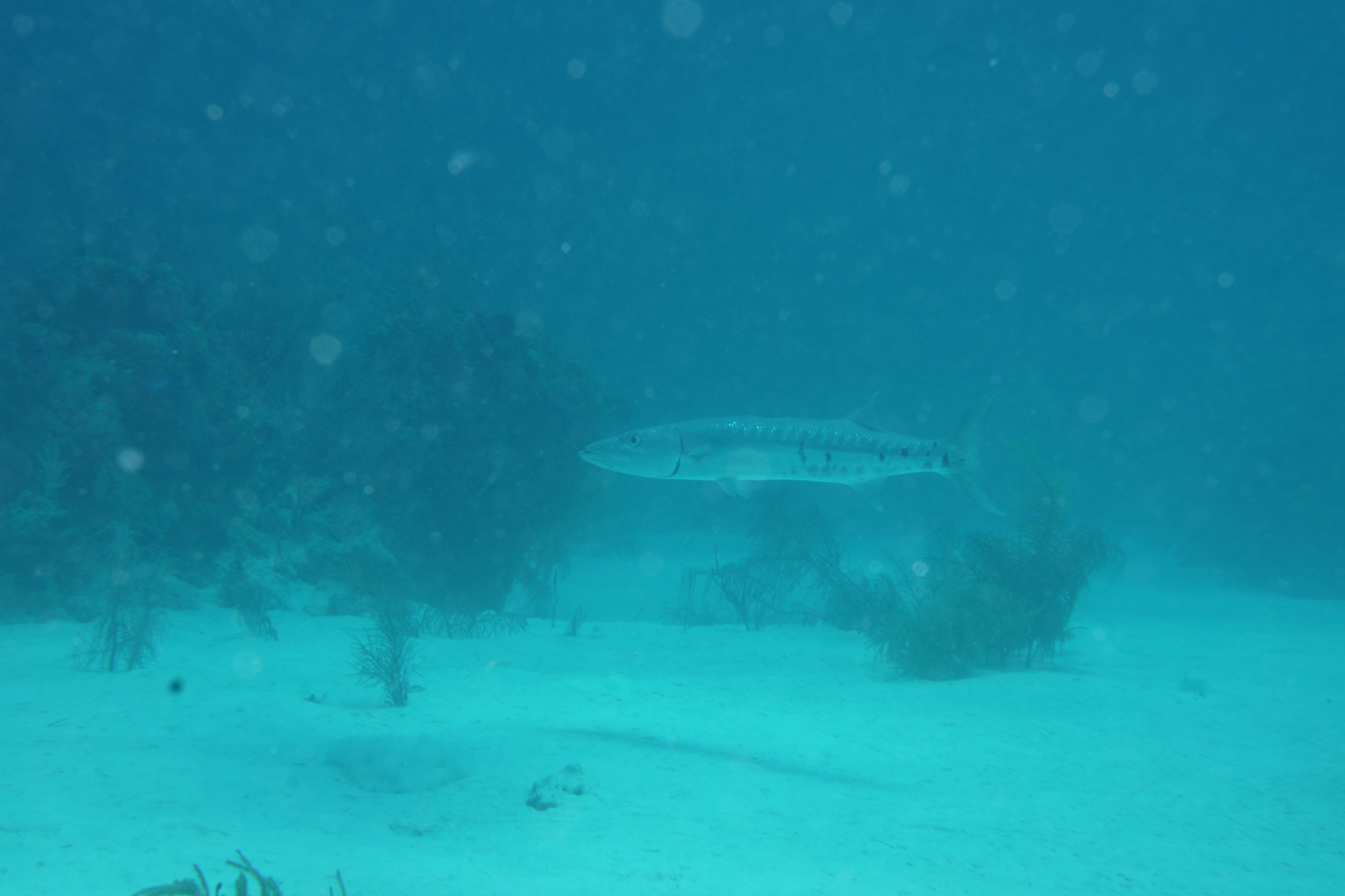 Final dive for the day was the Chimney at Half Moon Cay. Natasha is in heaven with all the pass-throughs. We started with the perfect one, the Chimney for which the site gets its name. Straight down and then up and out at 86 ft. It was deeper than we should have gone today, but we did it as a bounce dive ascending quickly when we came out of the reef. There was another zig-zag pass-through with a barracuda at the turn. Hello!