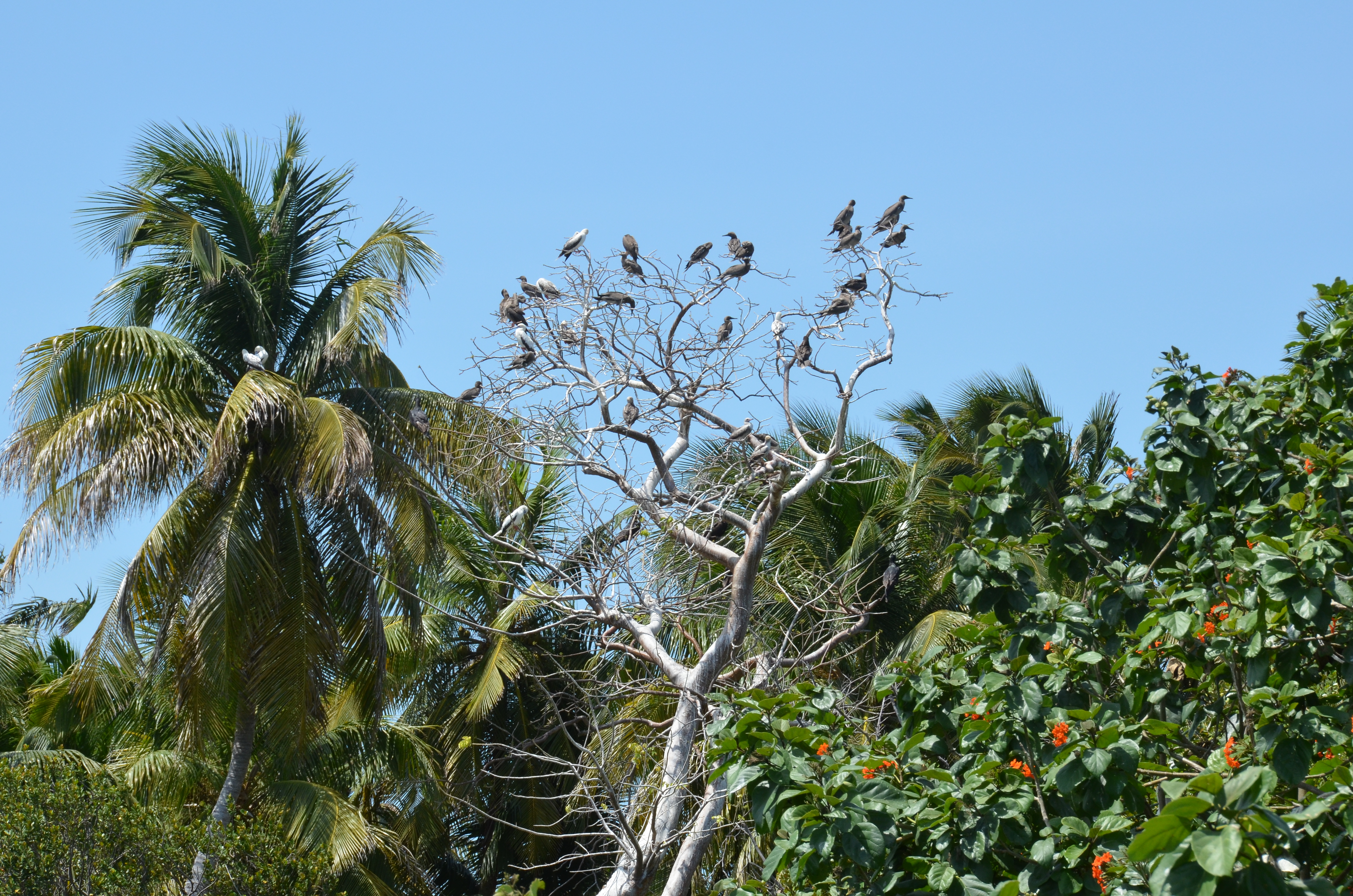 After this dive was went to Half Moon Cay to enjoy a picnic lunch of fried chicken. Yummy!! Half Moon Cay is considered a natural monument and the island is maintained by the Belize Audubon Society. There is a small entrance fee to enjoy the dock, picnic tables, marked trails, and boobie observation deck. Turneffe Atoll is the closest of three Atoll to Belize. Half Moon Caye is located on the southeast corner of Lighthouse Reef Atoll, the furthest from Belize of the three atolls. With about 4,000 breeding birds, it is the only known breeding colony of the red-footed booby.