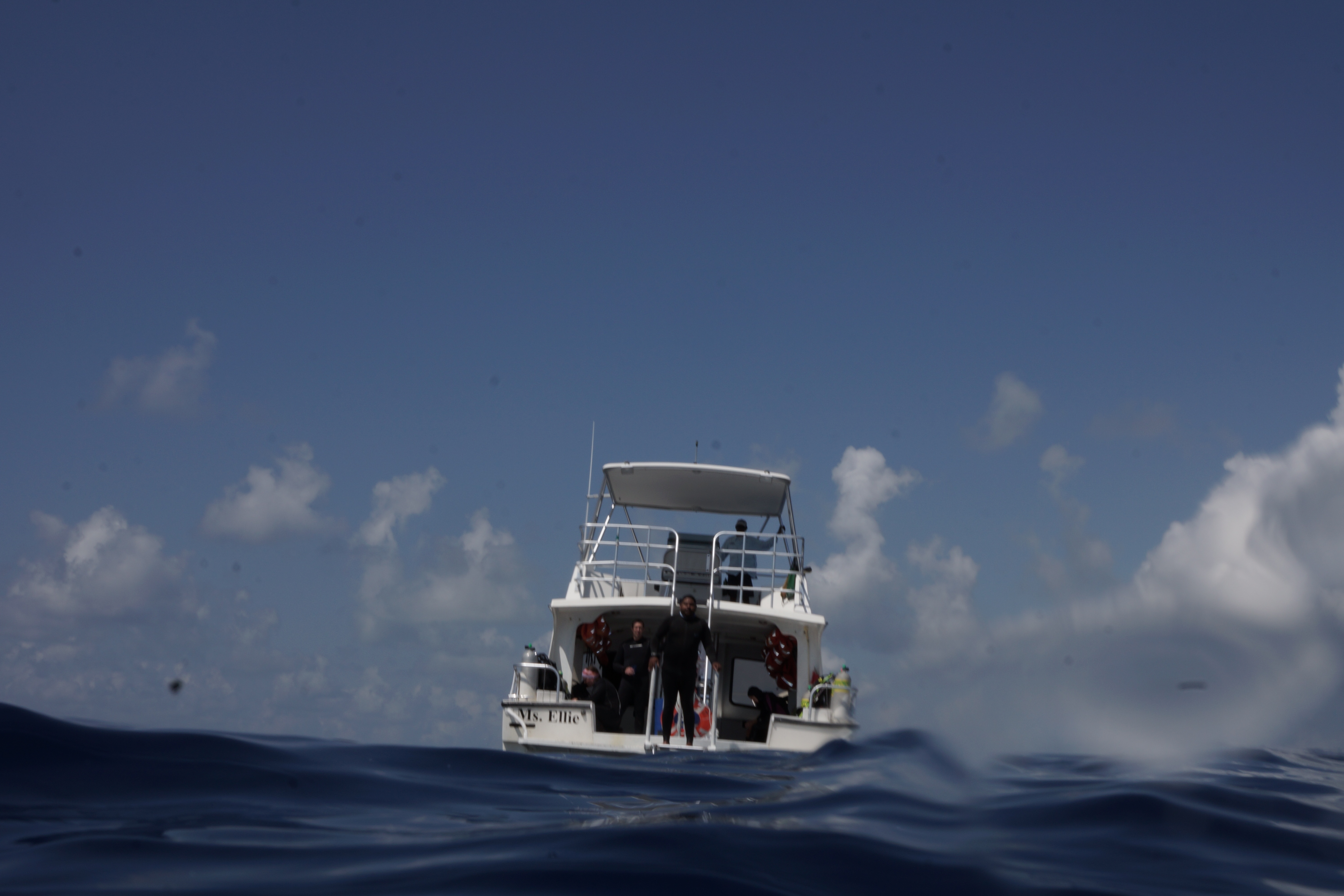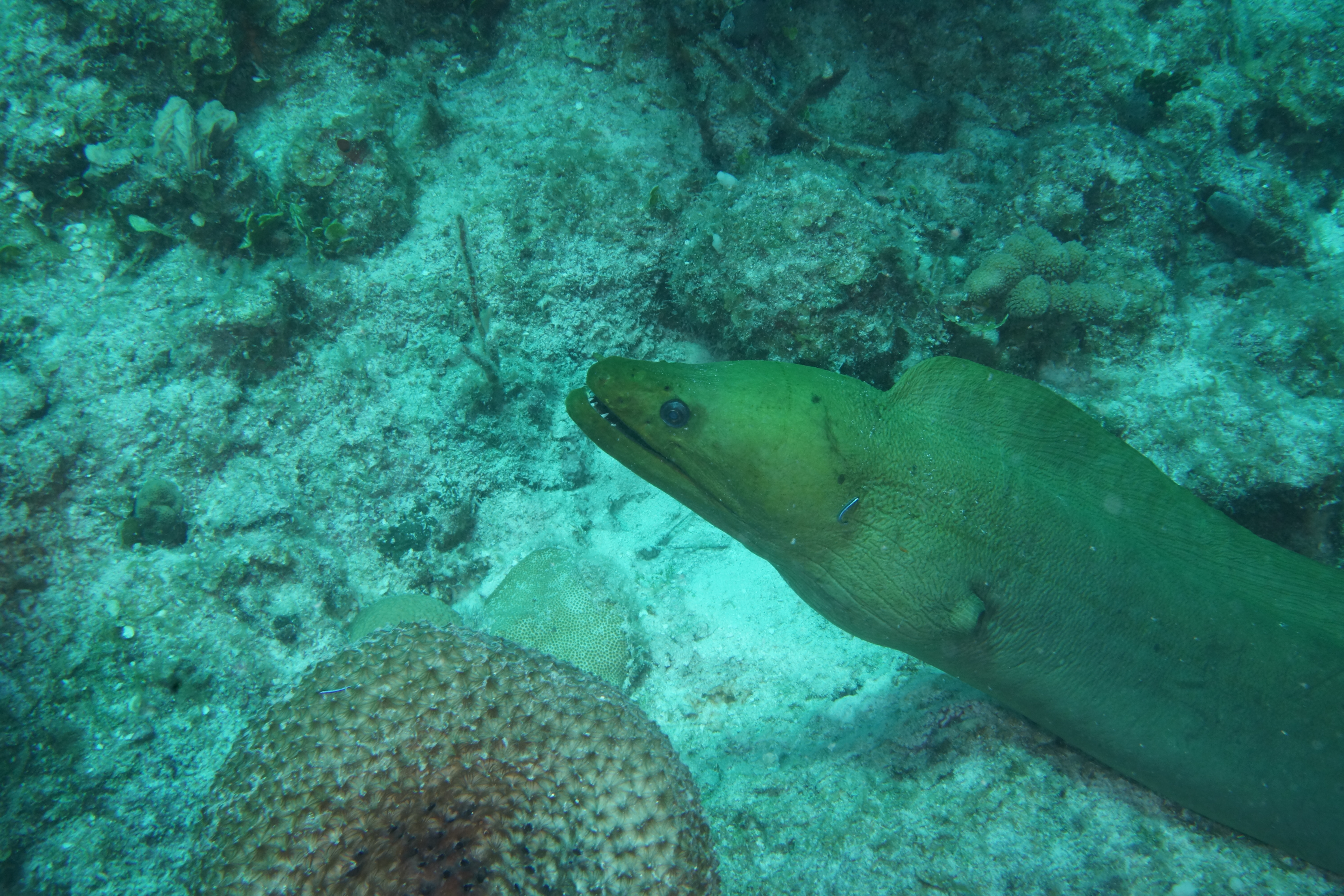 The following day we head to The Elbow at the the southern tip of the Atoll. This is the site to see large sealife and schools of big fish. We were warned that this dive could be rougher than yesterday’s botched attempt to reach Lindsey’s Back Porch. The Elbow did not disappoint. We saw large schools of spadefish and snapper, southern stingrays, a hawksbill turtle, several barracuda, and were very close to a small school of horse-eyed jacks. Of course my favorite was the beautiful spotted eagle ray we saw in the grassy flats that gracefully moved toward us before heading out. The dive was not as challenging as I expected. There is no predicting the current.