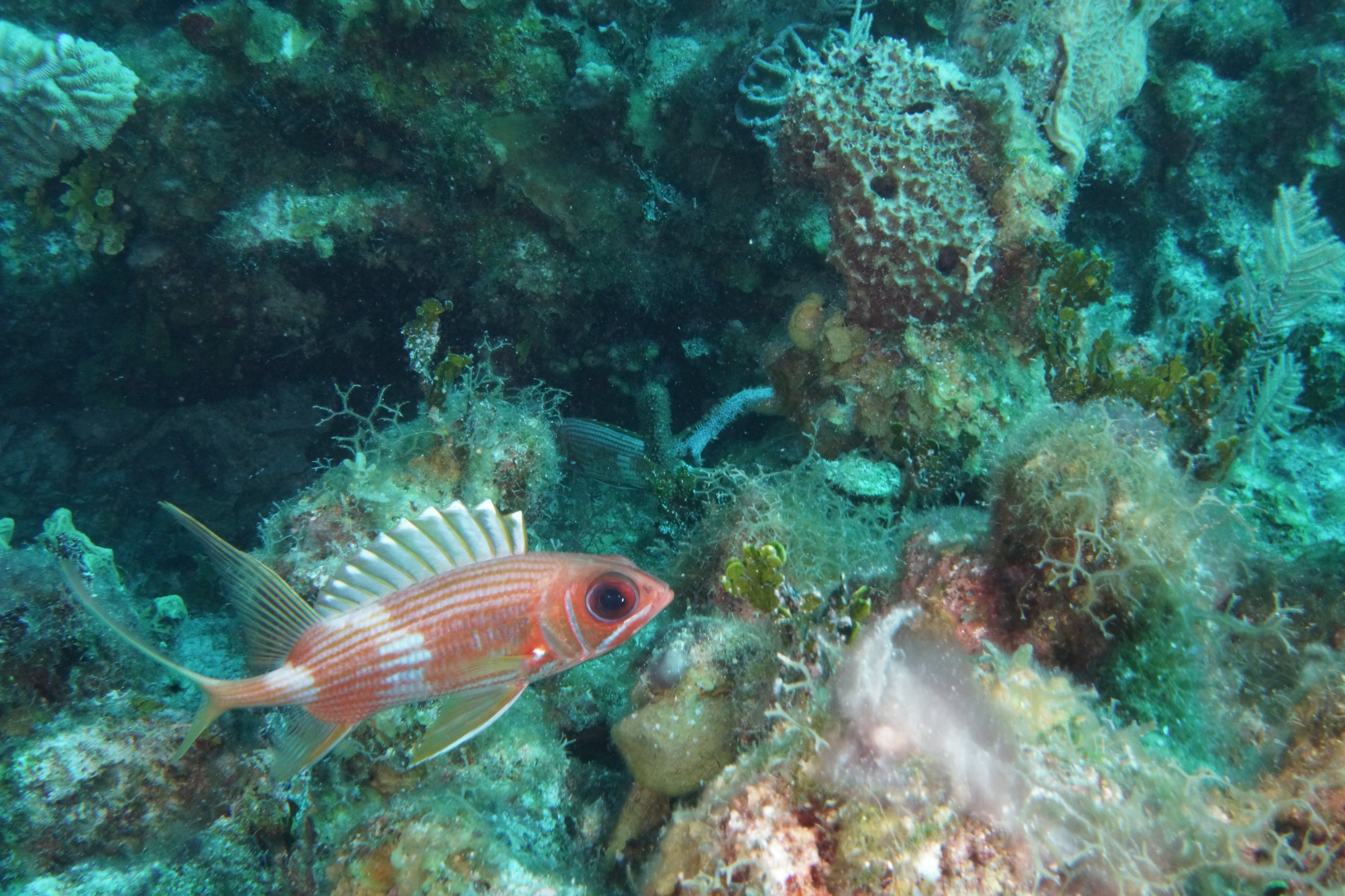 Our next dive was outside the reef and the visibility was poor. However, we still saw lots of goatfish, squirrelfish (with their large eyes), yellow-headed jawfish, a barred hamlet, a juvenile drum, along with the seemingly millions of small smooth trunkfish. I spotted another of the small Pederson shrimp.