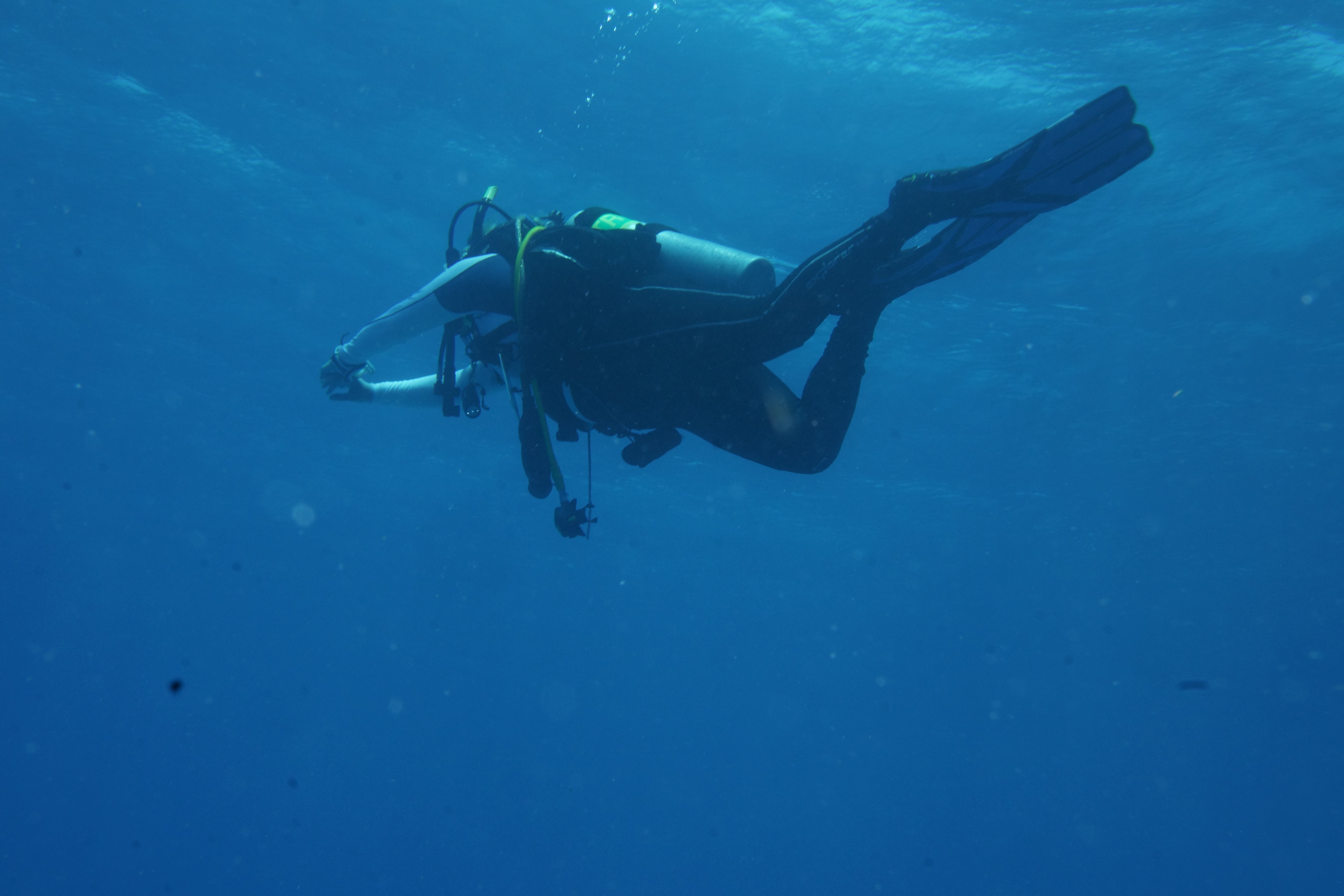 The first dive was another aquarium dive, only now I can name what I am seeing. Not only am I identifying the fish, but also their behaviors as well. I saw “hanging” Creole Wrasses, a “drive-through car wash” at a cleaning station, kissing fish, and who can forget Donna’s boyfriend. The second dive at Midway was even more populated. Of course since it is my last day, the Atoll treated me to the sighting of a spotted eagle ray. I found a ballonfish, a type of pufferfish. Our dive guide grabbed it and it puffed up fully. We all got to touch the spines and watch it slowly return to its normal size as it swam away.