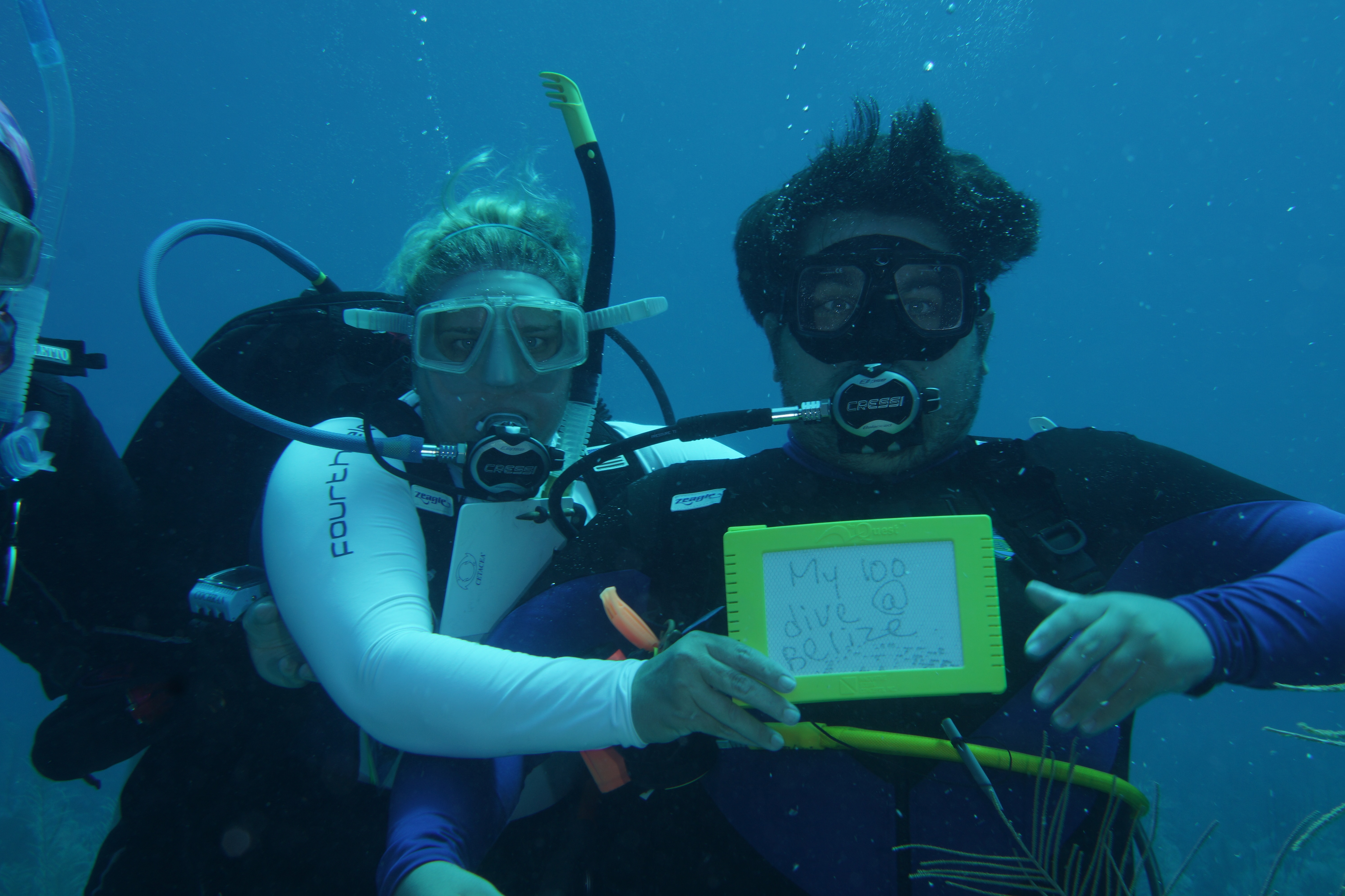 Rocky reached 100 dives on our trip to Belize. He is now also a master diver. Natasha the proud mom is holding the slate.
