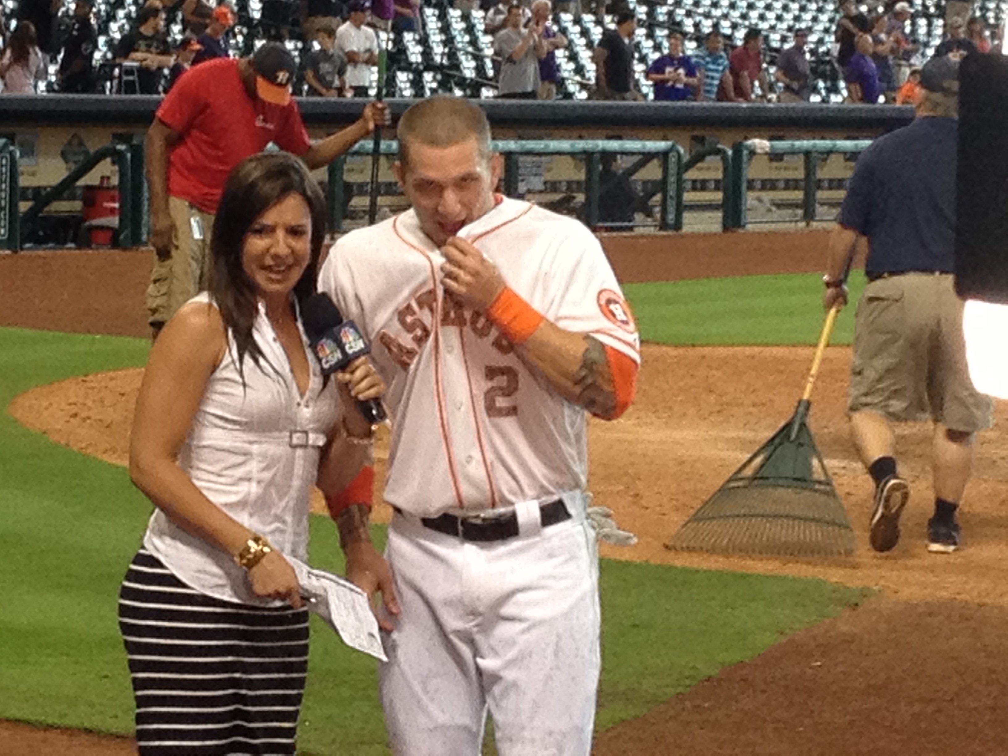 After a players’ celebration on the field, a female news reporter pulled Brandon Barnes over to talk about his game winning hit. The rest of the team had other ideas and Barnes got soaked in gatorade as did the front of the female reporter’s white shirt. Rocky got a great picture. (Looking for the best link on Brandon Barnes I noted that his wikipedia entry has already been updated to acknowledge the game-winning hit and that it was the first walk-off hit of the Astros’ season.) It wasn’t over for Barnes. He also got a shaving cream pie in the face. He was a class act. He continued to sign kids’ baseballs while the shaving cream burned.