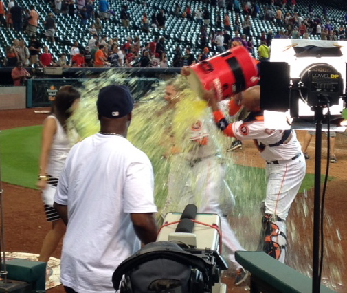 Rocky got this great shot of the gatorade being dumped on Brandon Barnes and a female reporter. Barnes had the game-winning walk off hit.