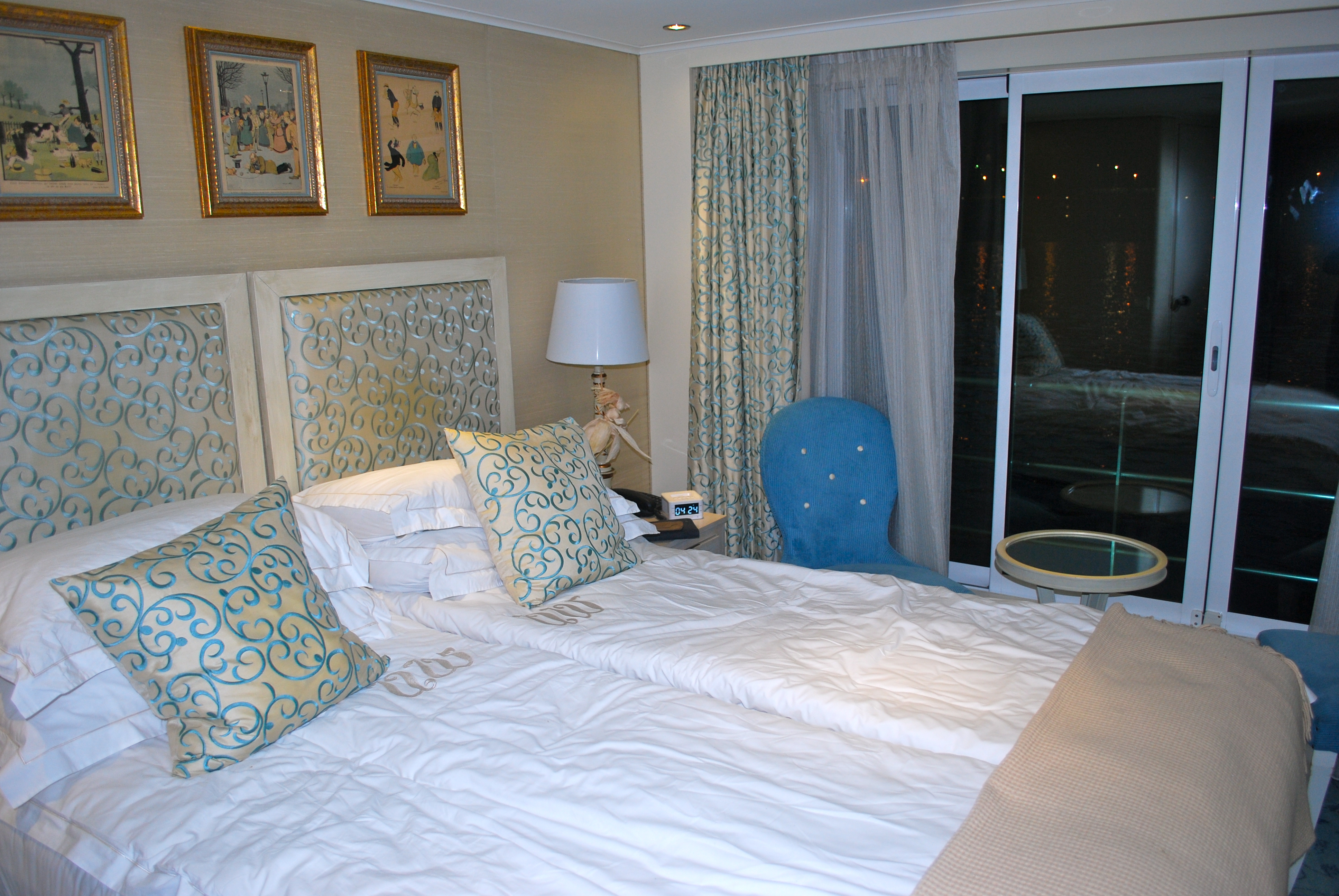 The highlight of the room is the Juliet balcony. It is too cold to leave open for long periods, although one passenger claims she left hers open all night. You can’t go out on the balcony, but the door opens floor to ceiling and it is wonderful for viewing or photographs.