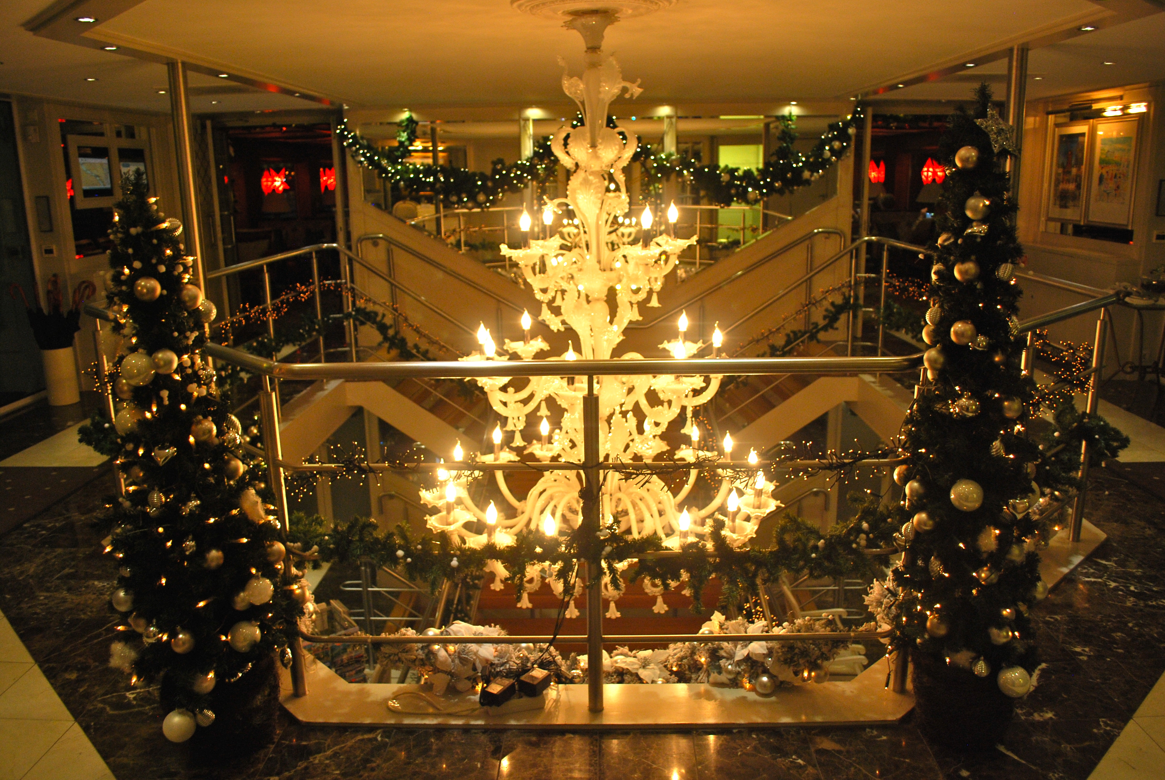 At the front end of the ship is the comfortable Lounge in its deep reds. Below it is the dining room decorated in neutrals with white and silver Christmas decorations-lovely. Gingerbread Houses are found throughout the ship. On the opposite end of the ship is the Captain’s Lounge and Library, open 24 hours a day with a fancy coffee machine. There is outdoor sitting which would be perfect in warmer weather. On the lower floor there is a very small gym and a self-serve laundry facility. The top level is the sun deck, nicknamed the freeze deck by the program manager in his presentation.