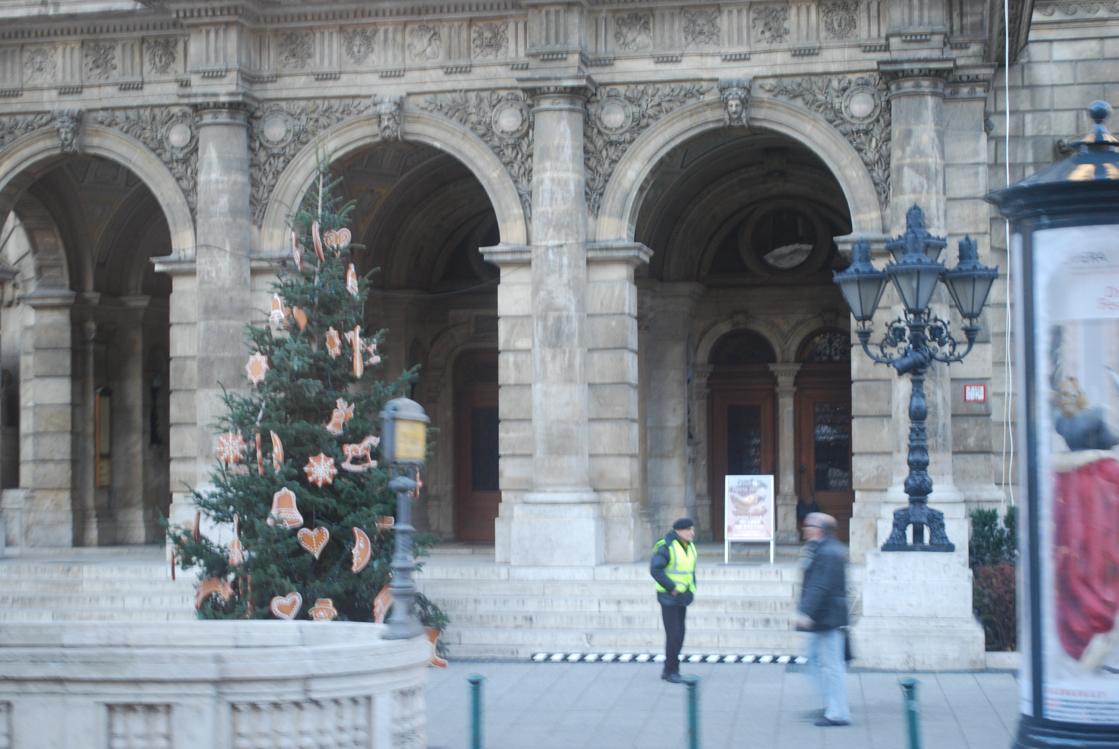 The opera house survived the war and as we passed we saw the guarded Christmas tree out front decorated with large-scale Gingerbread ornaments. We saw St. Stephen’s the large Catholic Cathedral with a dome to rival that of the parliament building. There was a small Christmas market and ice-skating rink at the church. All the trees along the avenues had lost their leaves, but were decorated with “fairy” lights and must be a spectacular sight at night.