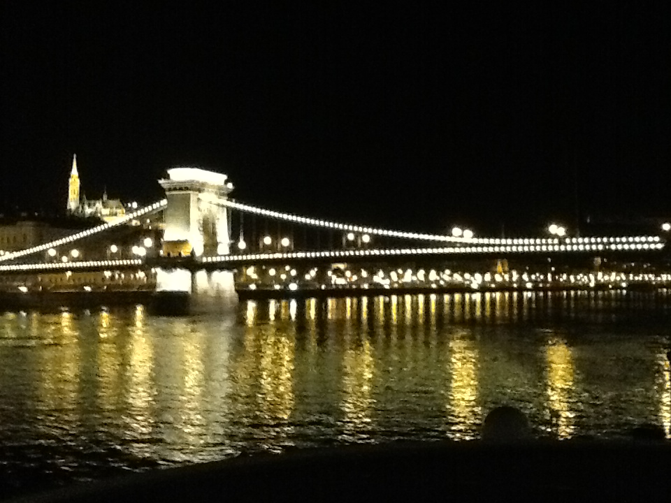 The Chain Bridge with St. Matthais Church in the background as we cruised out of Budapest at night.