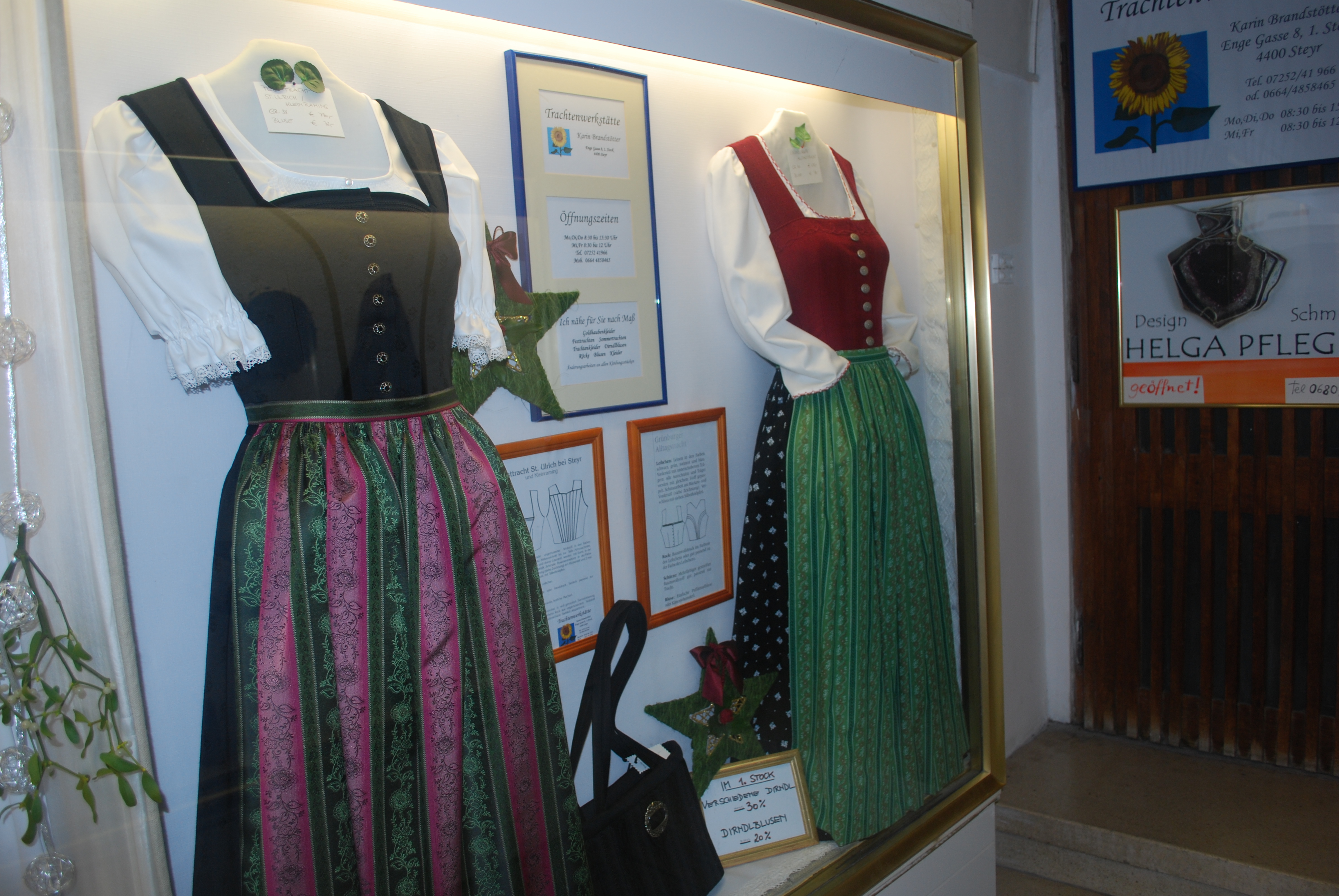 After the meal, I dealt with the impossible Internet so I could check in for our flight home. About 2:30 or 3 pm we ventured out again. We started at the clothing store. Boris got a vest and shirt to match his Loden jacket and hat. He really wanted me to get a traditional dress, apron, and blouse (a dirndl). He picked a silk one. There was also a fabulous jacket of cloth, leather, and embroidery that he picked out for me for Christmas. I was rather surprised. Prices were about a ¼ of the other store’s prices. I think Boris was just so excited that I found the shop.