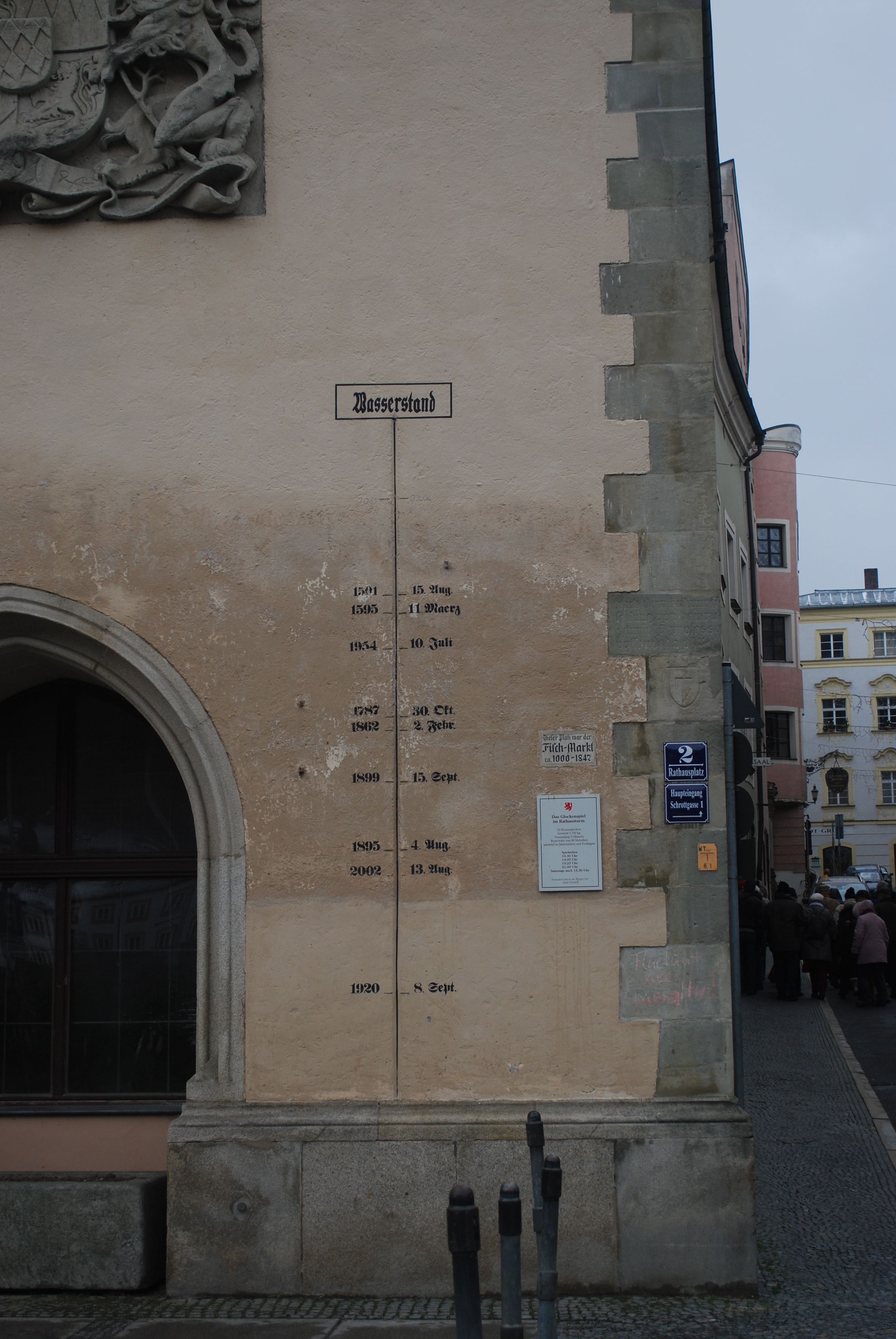 Water level markings on the same clock tower as seen in the previous picture. The 2013 level is above all those shown here. Passau, Germany