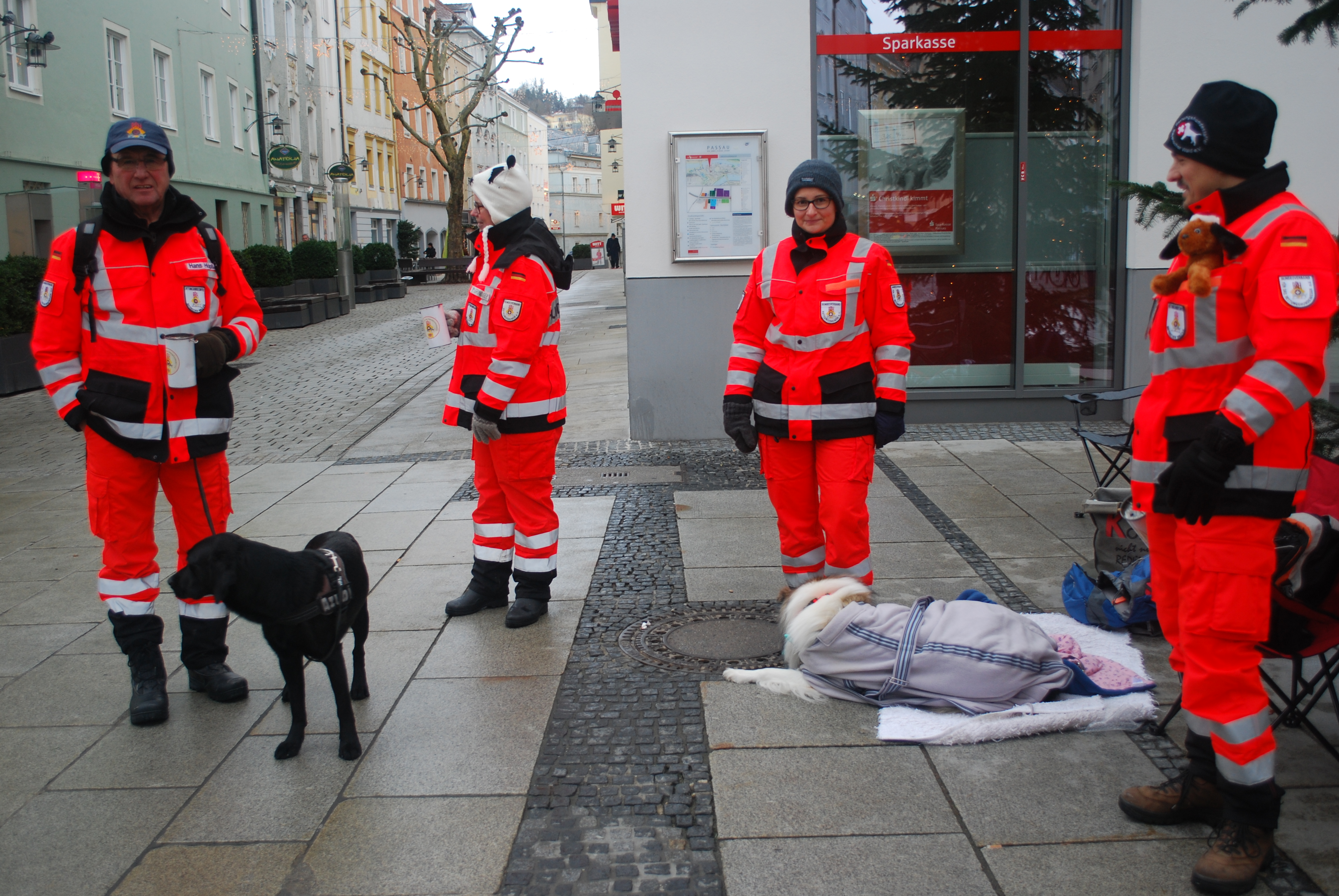 Major shopping area in Passau Germany. Those in bright red are firemen with rescue dogs collecting support.