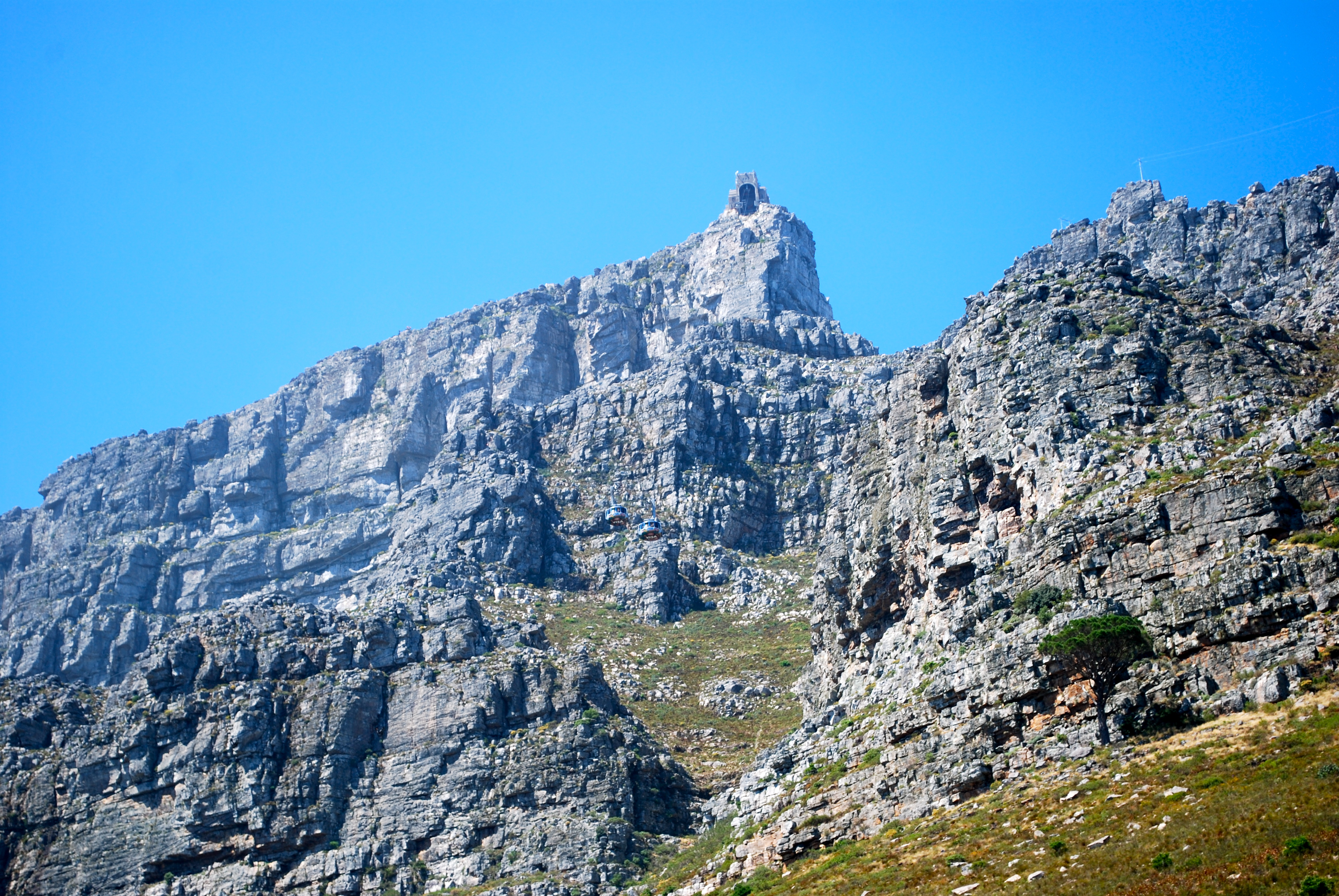 The Summit of Table Mountain with the Cable Car Tunnel Station at the high point. If you look closely at the photograph, you’ll see the two cable cars passing each other.