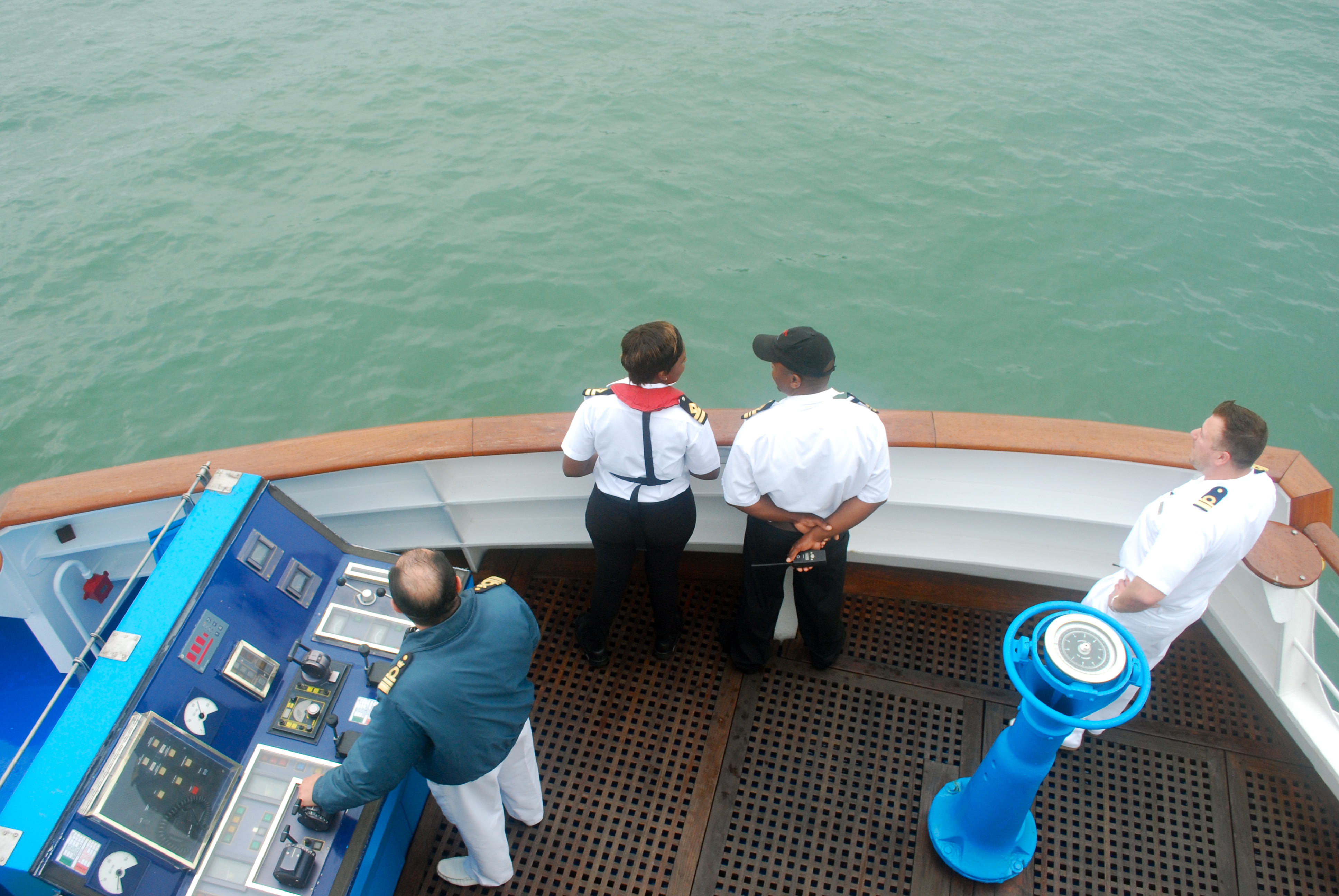 Officers on the Silver Wind Navigational Bridge which hangs out over each side of the ship to assist with docking. Our captain is at the the controls, our pilot is in white, and the two other officers are the port pilots for East Durban.