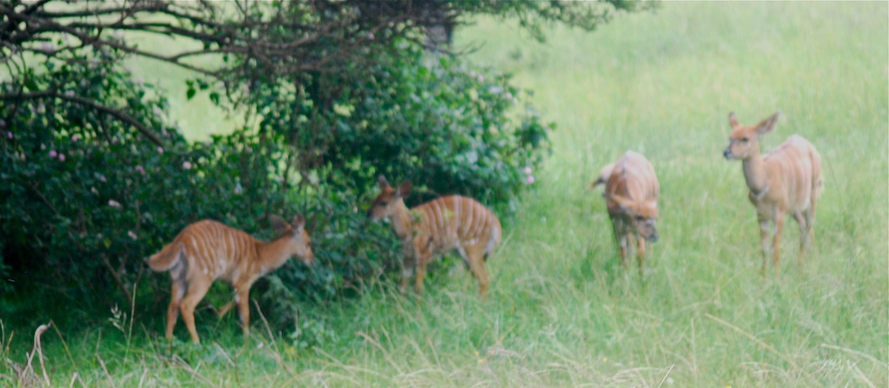 We saw lots of antelope-nyala, impala, and the large eland.  The name and mascot for the South African rugby team is an antelope, the springbok.  In spite of the date of conception, the nyala synchronize the birth of their babies so they can all be born at the same time.  The females then establish a nursery and all the females take care of all the babies.  We saw a breeding group of nyala with one male and up to 45 females.
